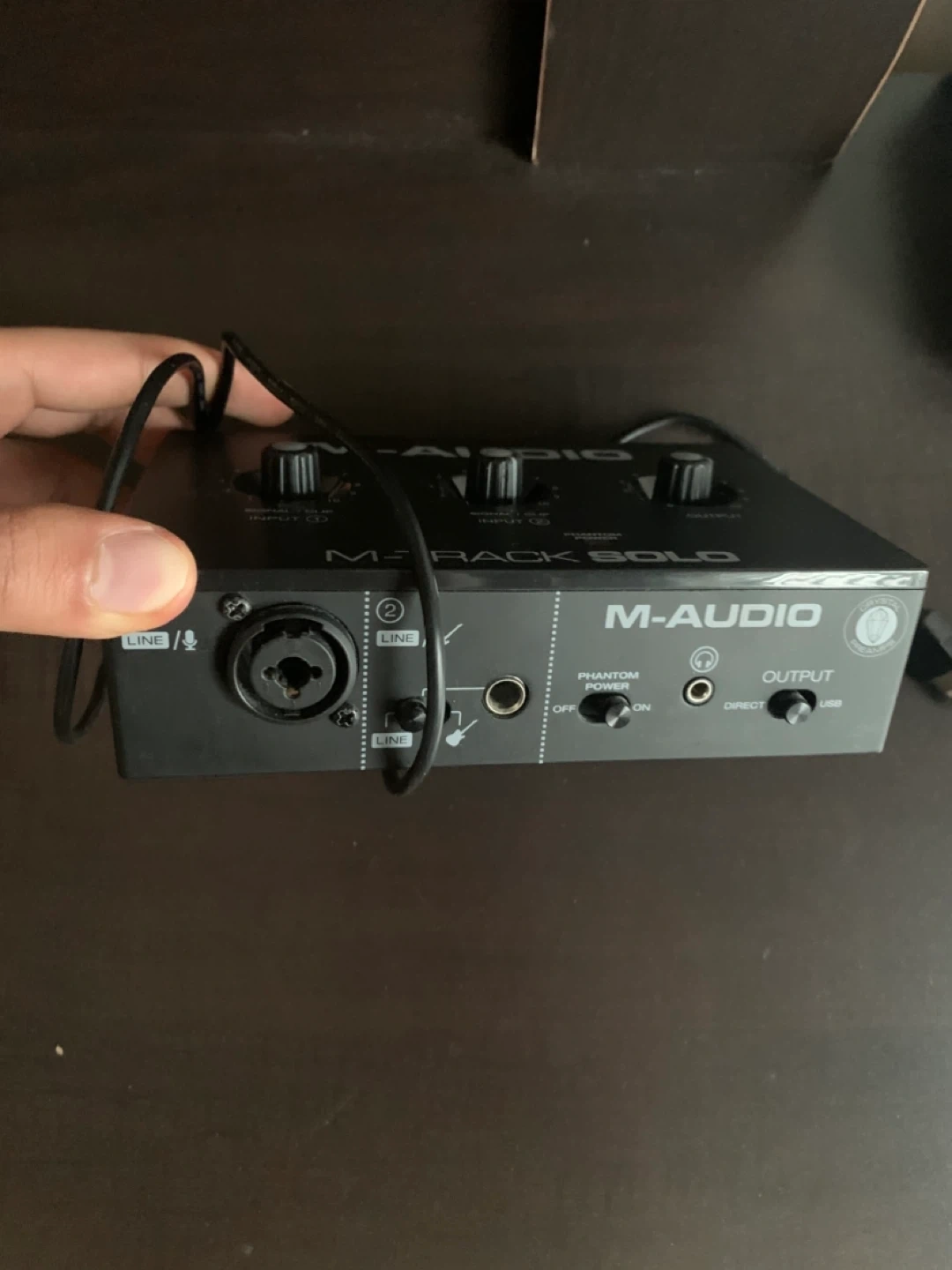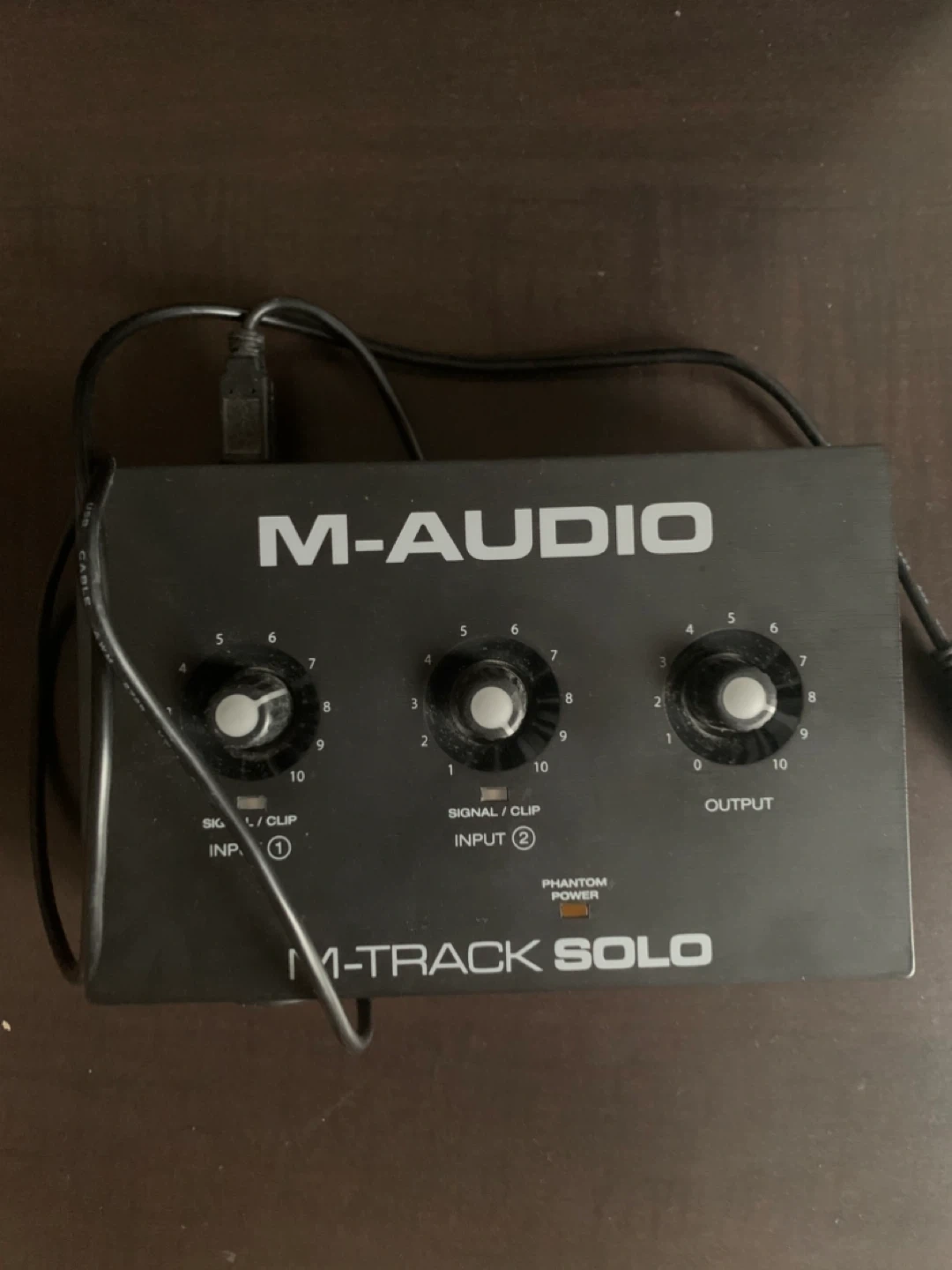 This is an M-Audio M-Track Solo USB audio interface. It features two inputs, one combo XLR/line input with phantom power, and one line input. The interface also has a dedicated output for monitoring.
