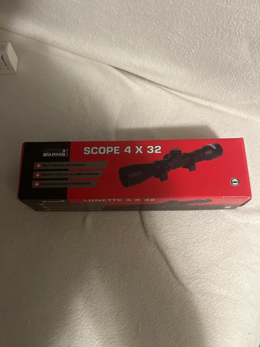 Selling a Swiss Arms Scope 4 x 32. The box mentions it includes lens covers and scope rings. It also has a standard 1 inch rubber finish body and is easy to adjust