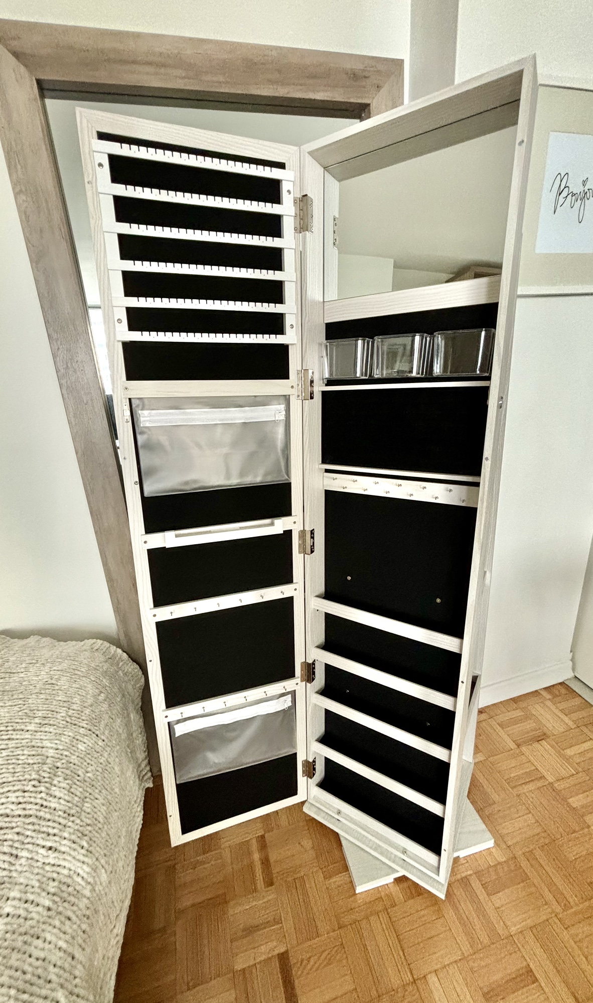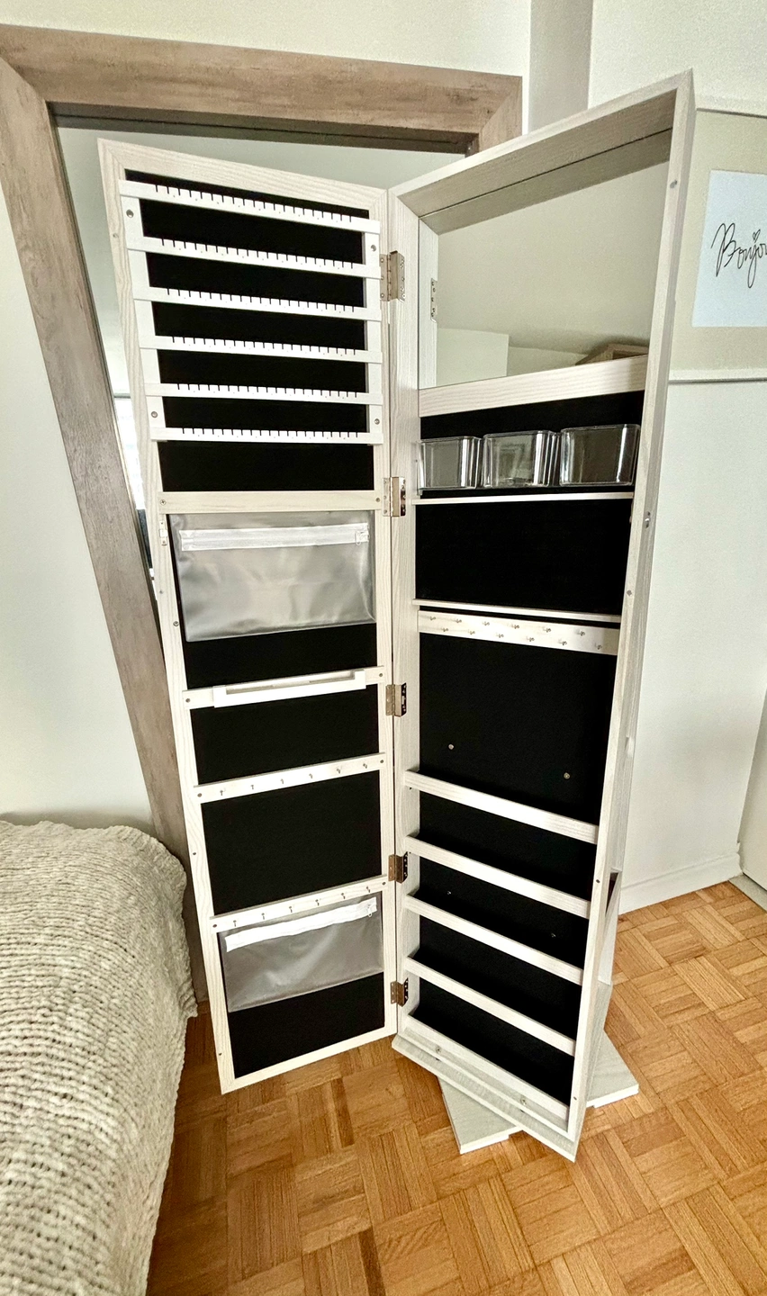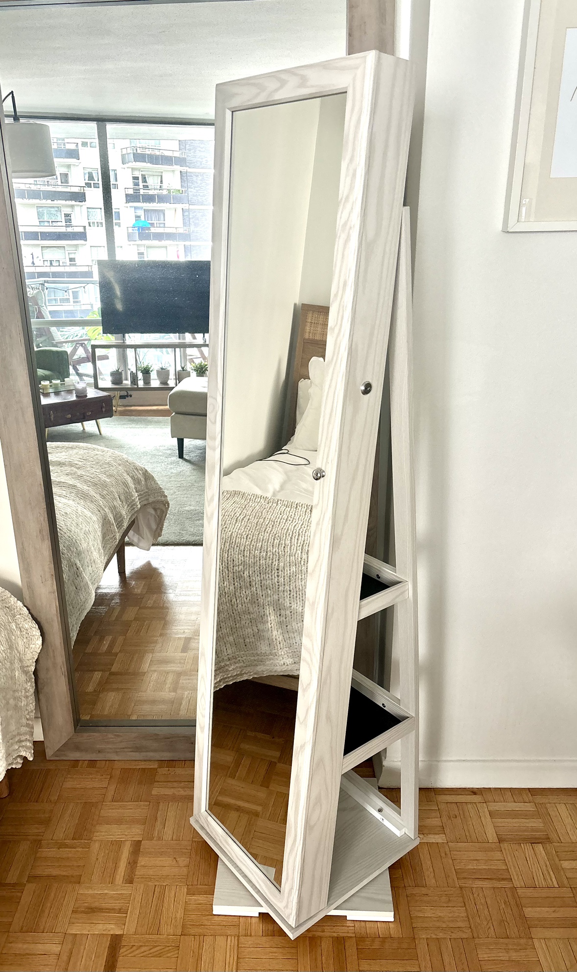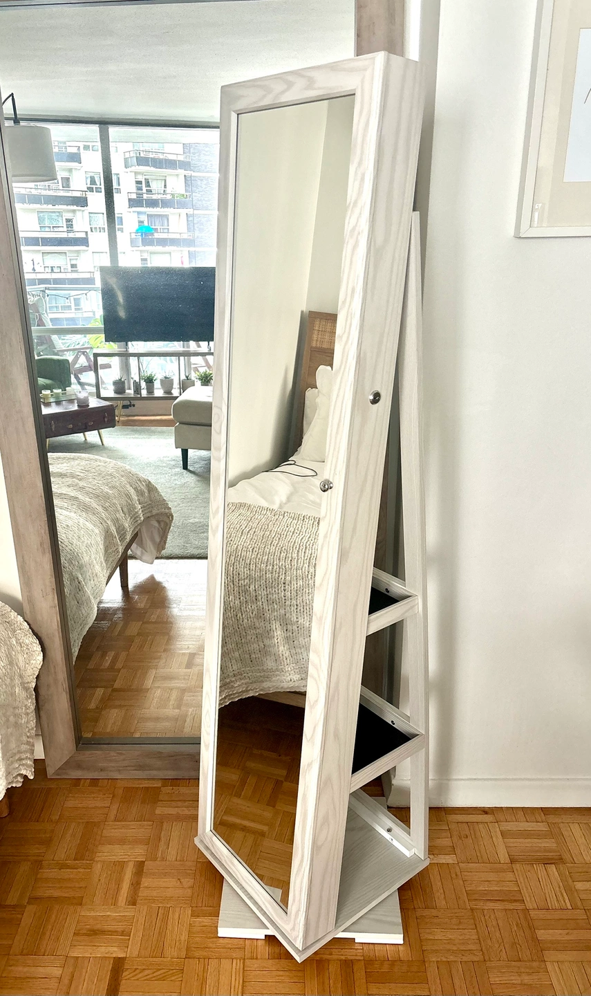 Tons of storage for jewellery and accessories in this mirrored cabinet! The mirror swivels smoothly and has three additional shelves behind it. Two keys are included. One acrylic cup has some light scratches on it (see photo) but otherwise everything looks essentially brand new. Selling only because I don’t have space in my new apartment - otherwise I’d be keeping it. Bought for over $200 a little over a year ago, asking for half. Pet free, smoke free, no water damage.