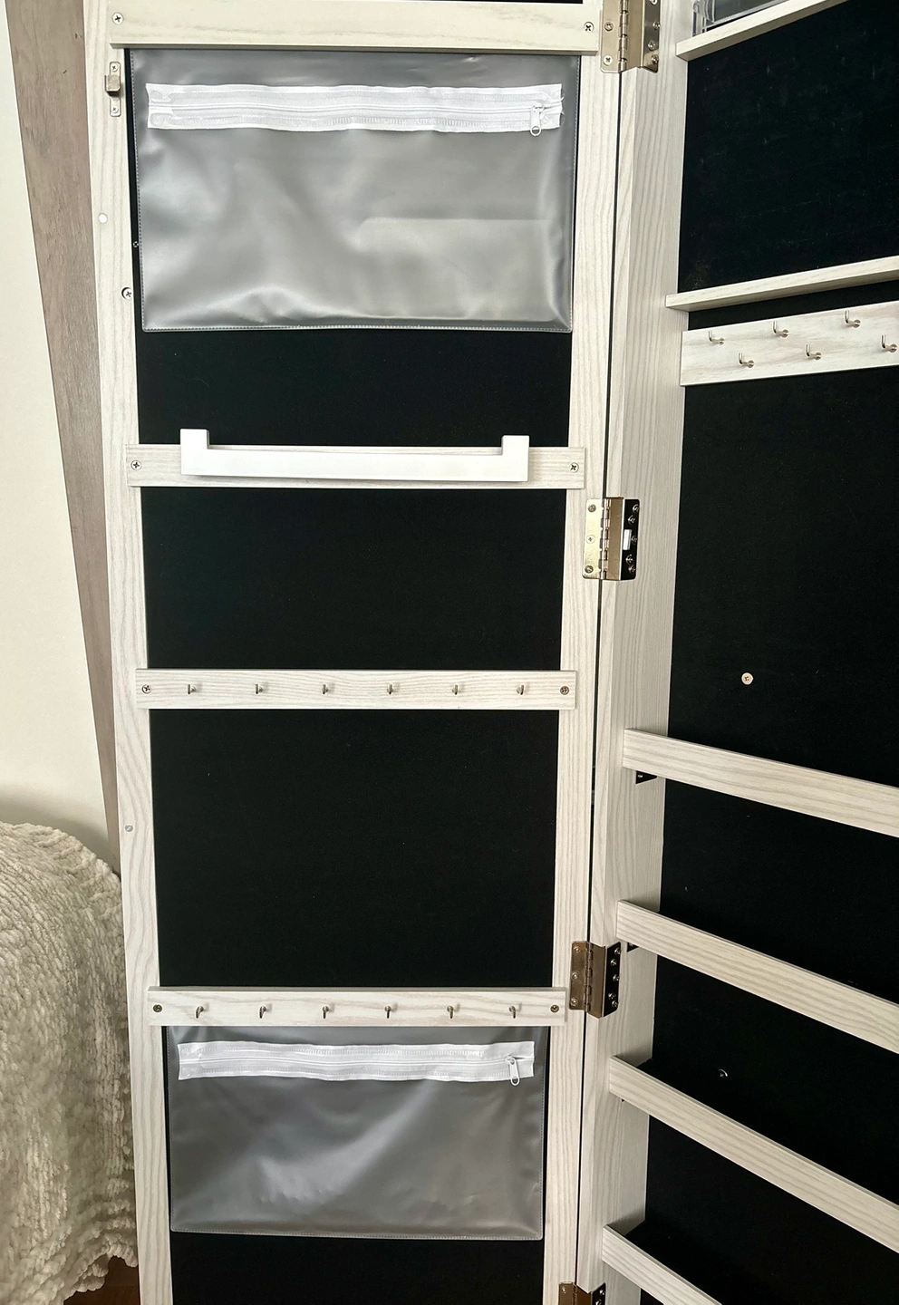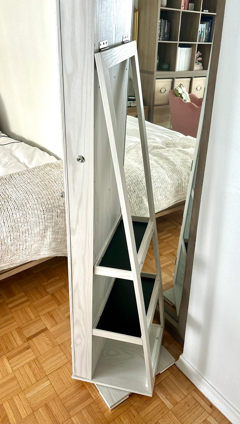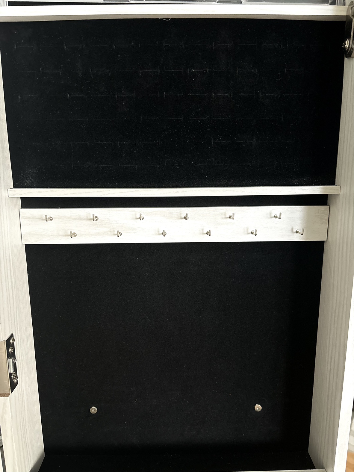 Tons of storage for jewellery and accessories in this mirrored cabinet! The mirror swivels smoothly and has three additional shelves behind it. Two keys are included. One acrylic cup has some light scratches on it (see photo) but otherwise everything looks essentially brand new. Selling only because I don’t have space in my new apartment - otherwise I’d be keeping it. Bought for over $200 a little over a year ago, asking for half. Pet free, smoke free, no water damage.
