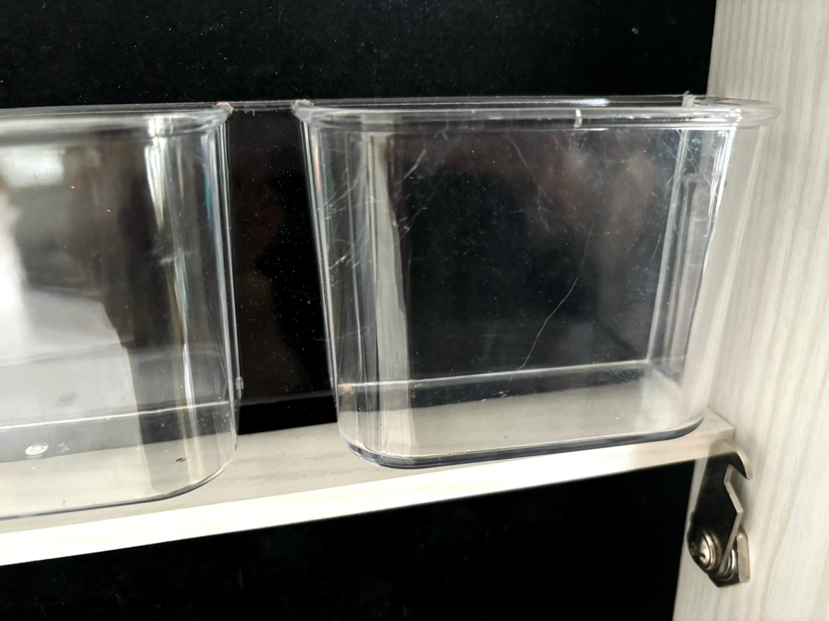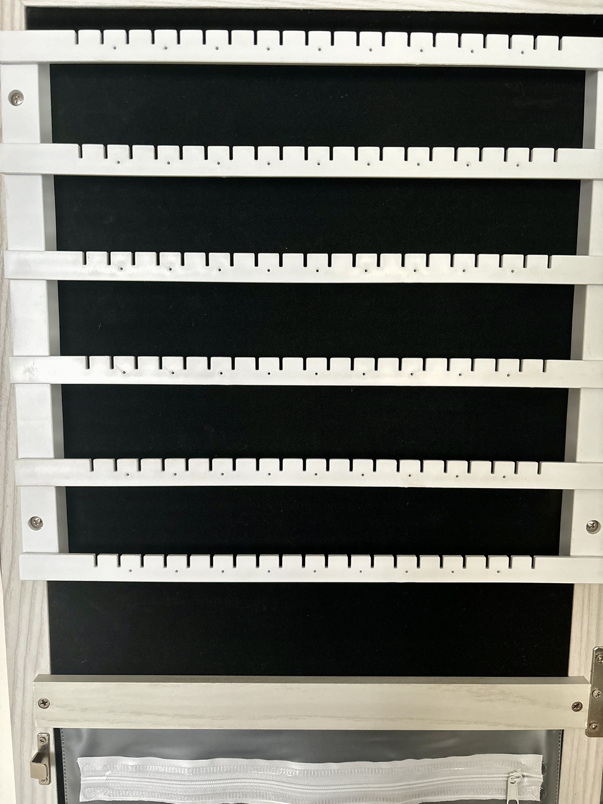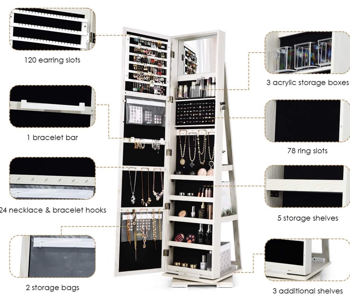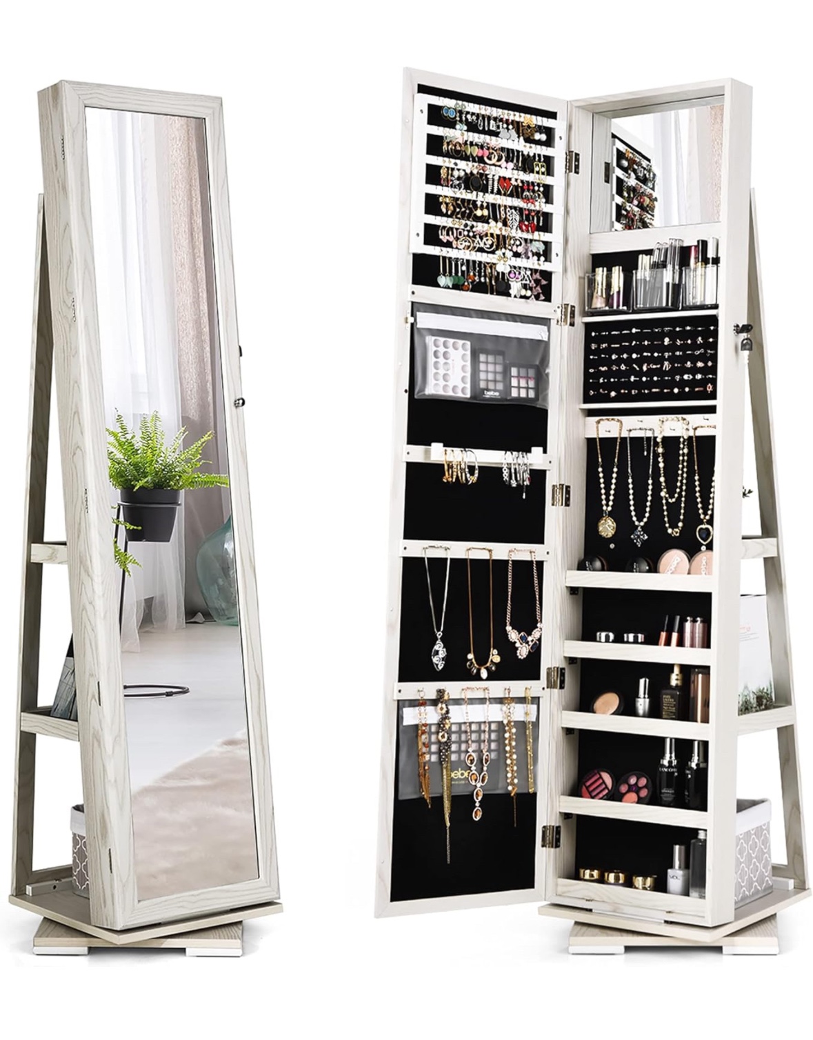 Tons of storage for jewellery and accessories in this mirrored cabinet! The mirror swivels smoothly and has three additional shelves behind it. Two keys are included. One acrylic cup has some light scratches on it (see photo) but otherwise everything looks essentially brand new. Selling only because I don’t have space in my new apartment - otherwise I’d be keeping it. Bought for over $200 a little over a year ago, asking for half. Pet free, smoke free, no water damage.
