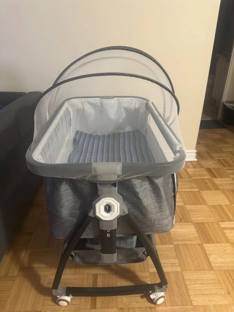 Selling a swivel sleeper gently used bassinet in excellent condition! It's perfect for keeping your little one close by during those early months. It features a sturdy base and breathable mesh sides for safety and comfort. The bassinet also swivels, making it easy to reach your baby from bed. It's lightweight and portable. It has a foldable design for easy storage and transport. Can adjust height to match with bed height. Has wheels to Cary along, wheel stop lock. Removable side rod.