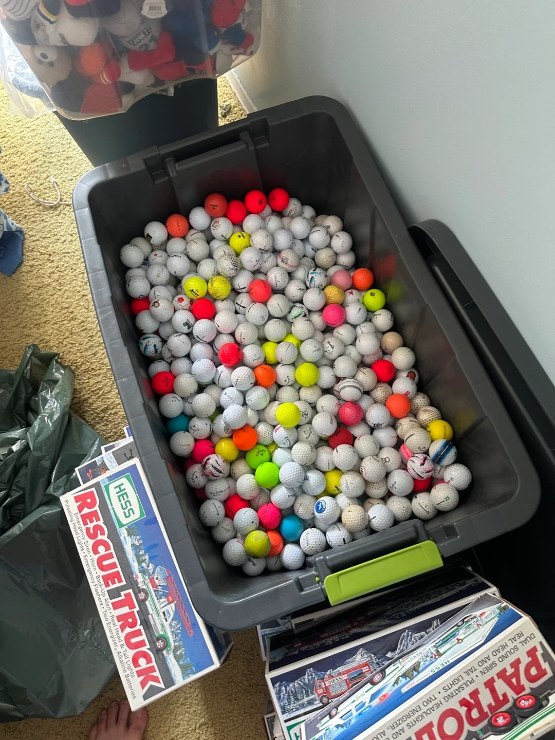 This is a large bin filled with a variety of golf balls. Many balls are white, but there are also several coloured ones like pink, yellow, orange, and green! The exact number of balls isn't known, but it's a substantial quantity. Contact me 6478283384 or 6476299277