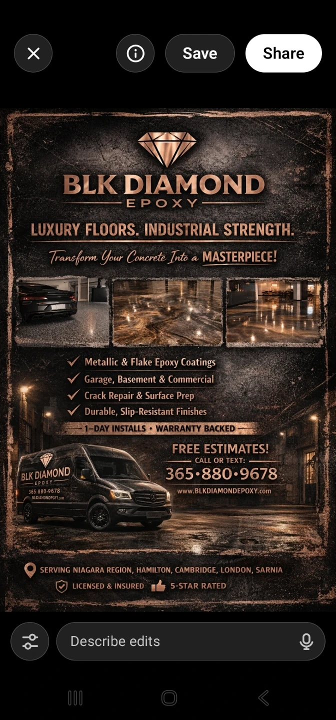 Blk Diamond offers premium floor coatings for residential and commercial spaces. Services include metallic and flake epoxy coatings, garage and basement floor solutions, and crack repair. They also provide durable, slip-resistant finishes with 1-day installations and warranty backing.
