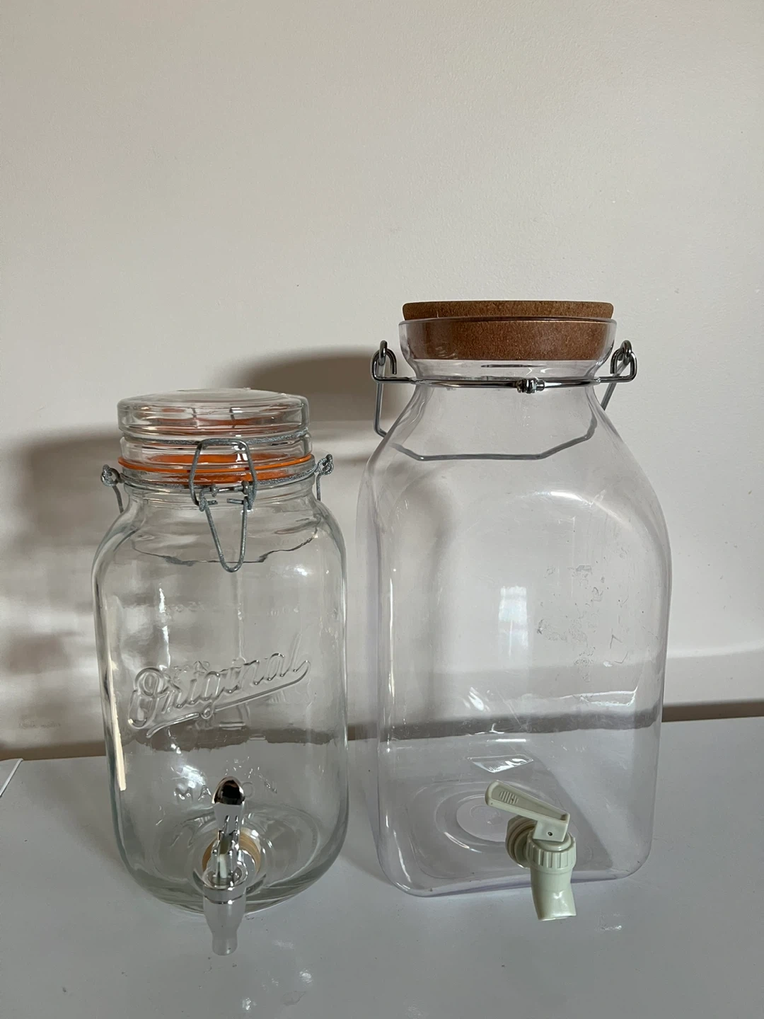Two beverage dispensers with spigots. One is a glass mason jar style with an orange seal and metal clasp. The other is a larger plastic square-shaped dispenser with a cork lid and a light green spigot.