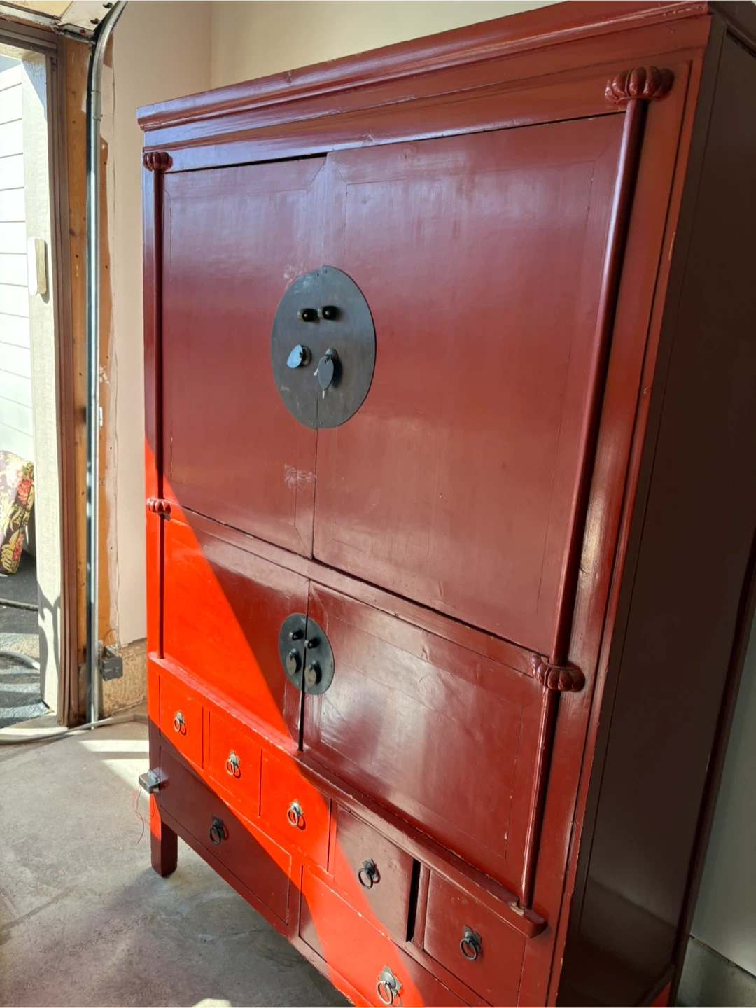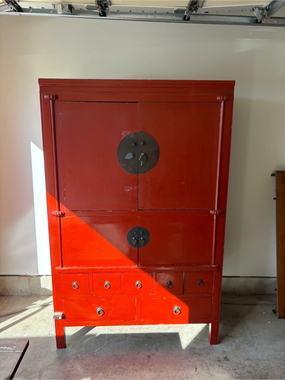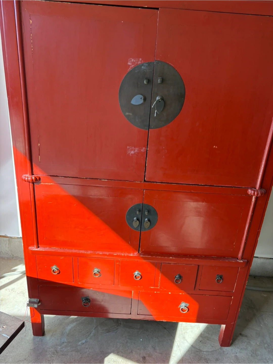 This red oriental cabinet features a unique design with two doors on top and multiple drawers below. It has brass-like hardware for both the doors and the drawers. The rich red lacquer finish gives it a classic look.