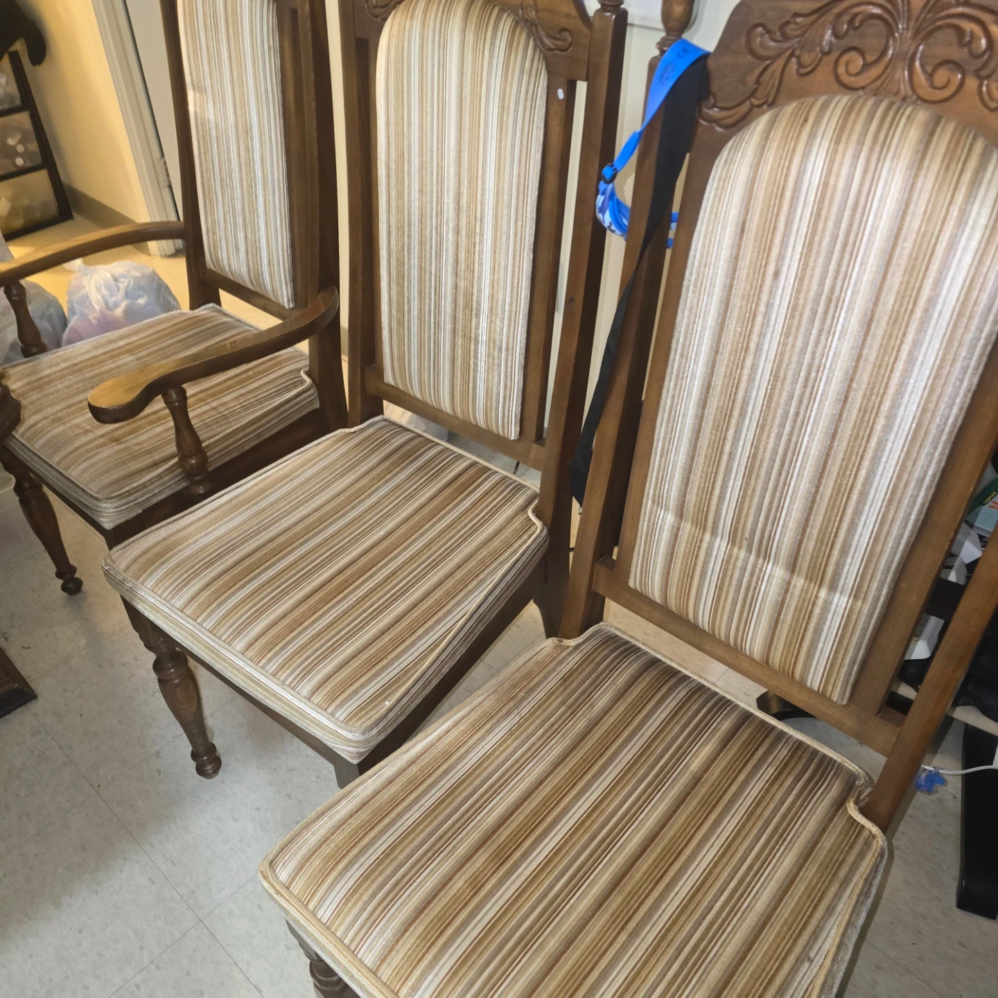 A vintage wooden dining table with 6 matching chairs. It also has an extender The set includes upholstered seating with a striped fabric pattern. It's perfect for family gatherings or everyday meals. The table has an expandable leaf for extra seating.