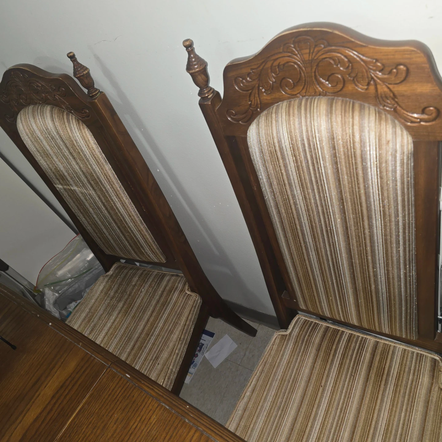 A vintage wooden dining table with 6 matching chairs. It also has an extender The set includes upholstered seating with a striped fabric pattern. It's perfect for family gatherings or everyday meals. The table has an expandable leaf for extra seating.