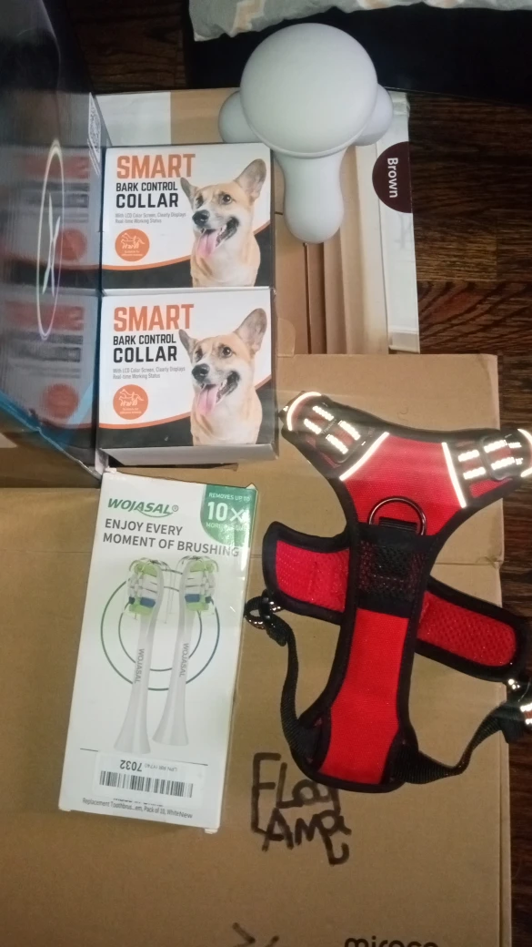 I have a few items for sale here! There are two Smart Bark Control Collars, a Wojasal toothbrush replacement head pack, and a red dog harness with reflective strips, each at a different price, just ask