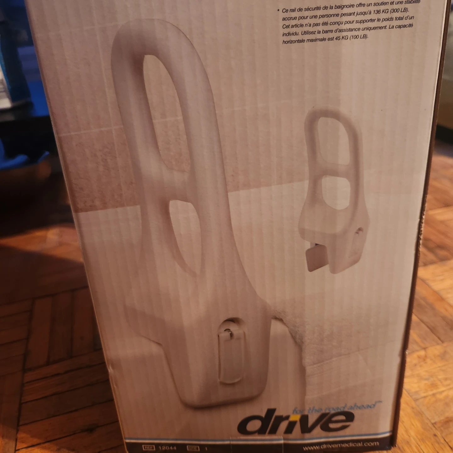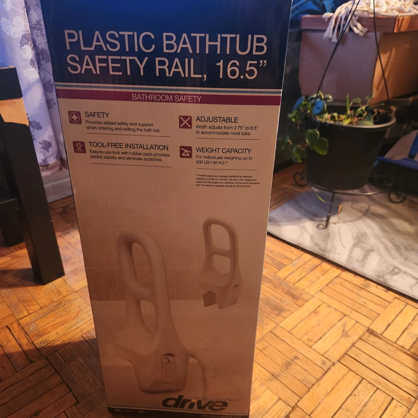 This bathtub safety rail provides added safety and support when entering and exiting the tub. It features tool-free installation with rubber pads for stability and scratch protection. The width is adjustable from 2.75" to 6.5" to fit most tubs. It has a weight capacity of 300 LB / 136 KG.