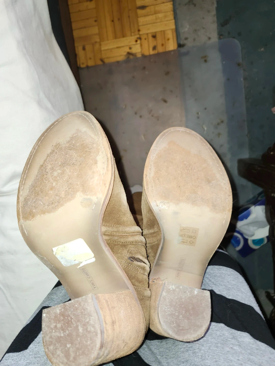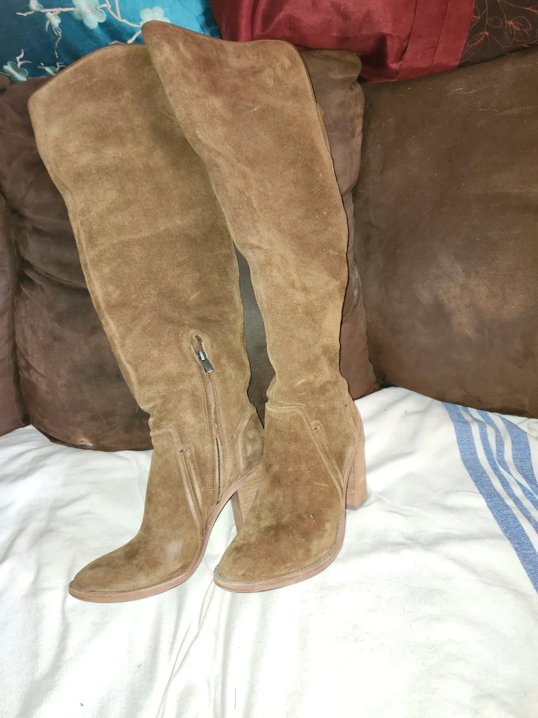 Selling a pair of Vince Camuto over-the-knee boots in brown suede. They have a stylish heel and a zipper detail. These boots are pre-owned and show some wear on the soles, but they are still in good condition for everyday wear!