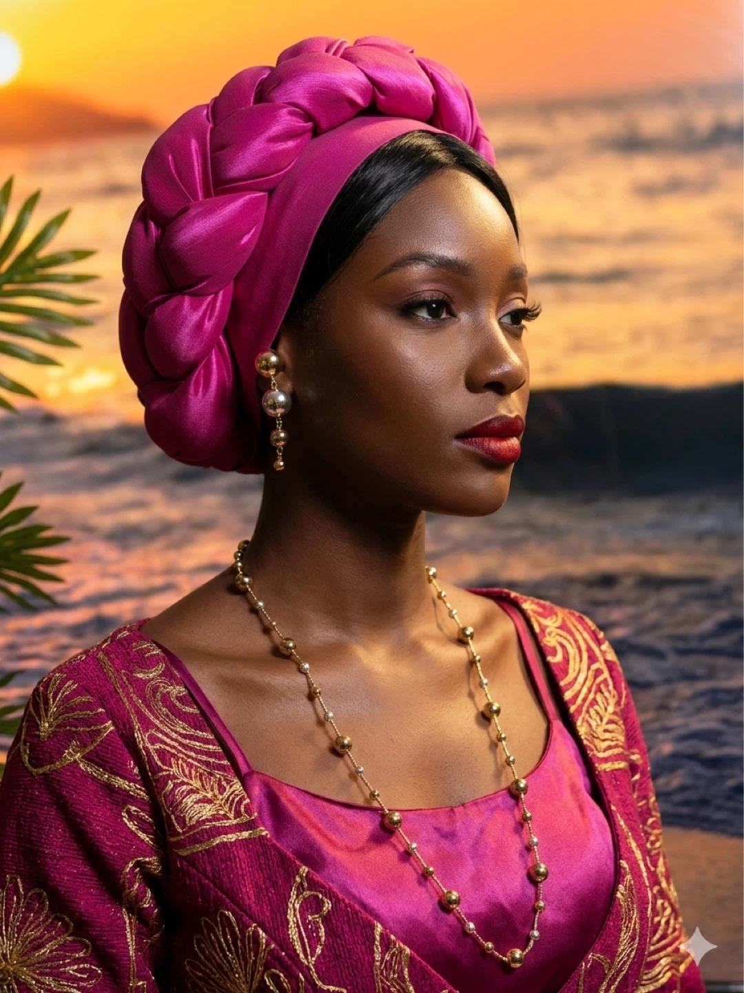 Fuchsia Braided Turban with Gold Beaded Necklace and Earrings