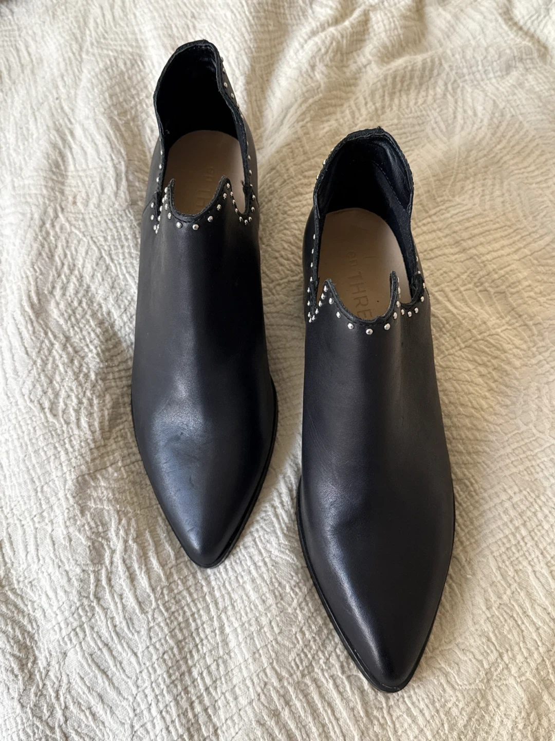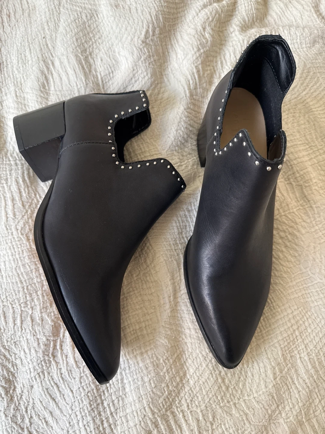 These black ankle boots are made of leather and feature stud detailing along the top edge. They have a pointed toe and a block heel. Great for adding a little edge to any outfit!