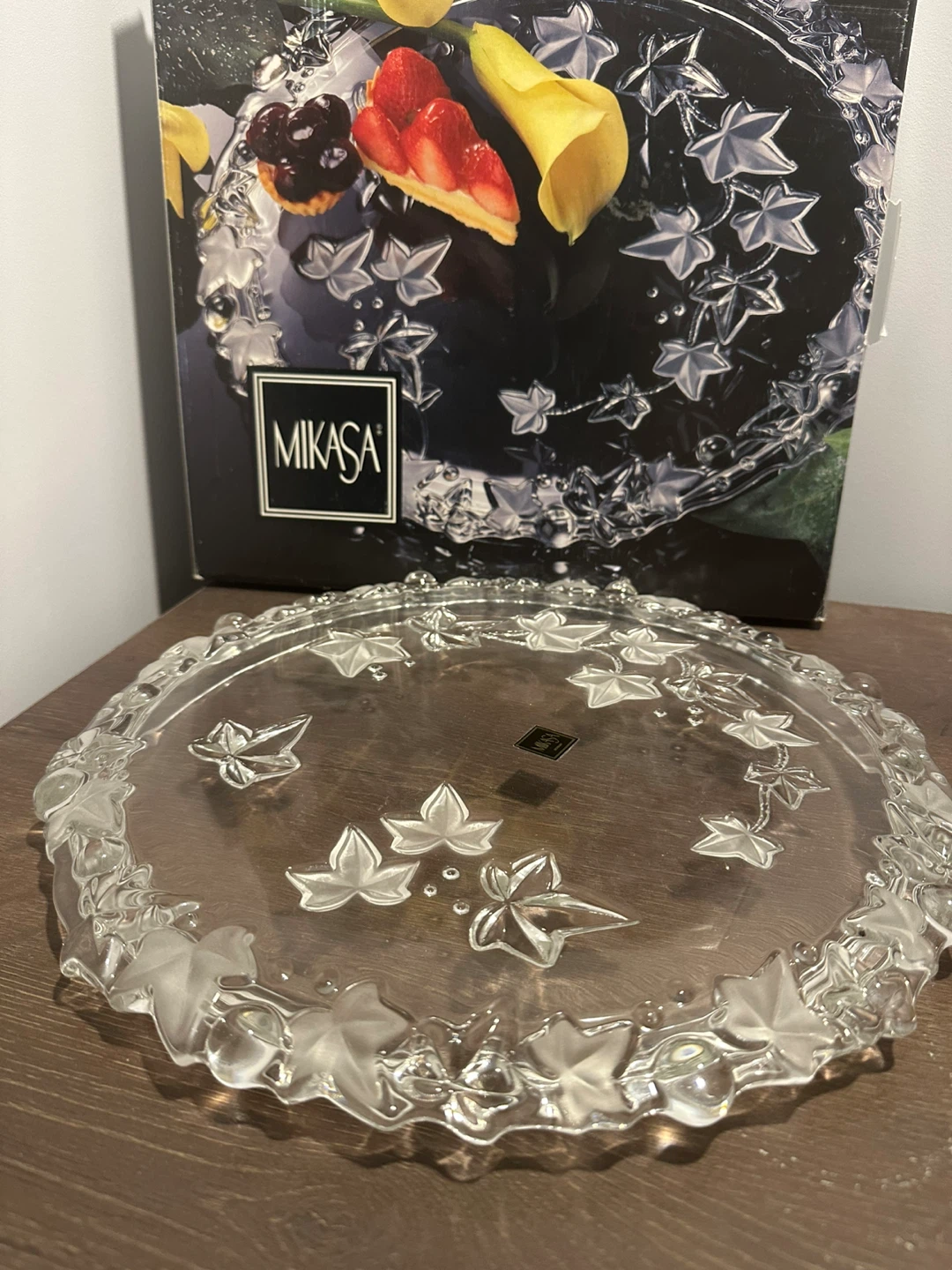 Beautiful glass cake stand featuring an elegant ivy leaf design. It's perfect for displaying cakes, pastries, or appetizers at gatherings. The raised edge helps keep items secure.