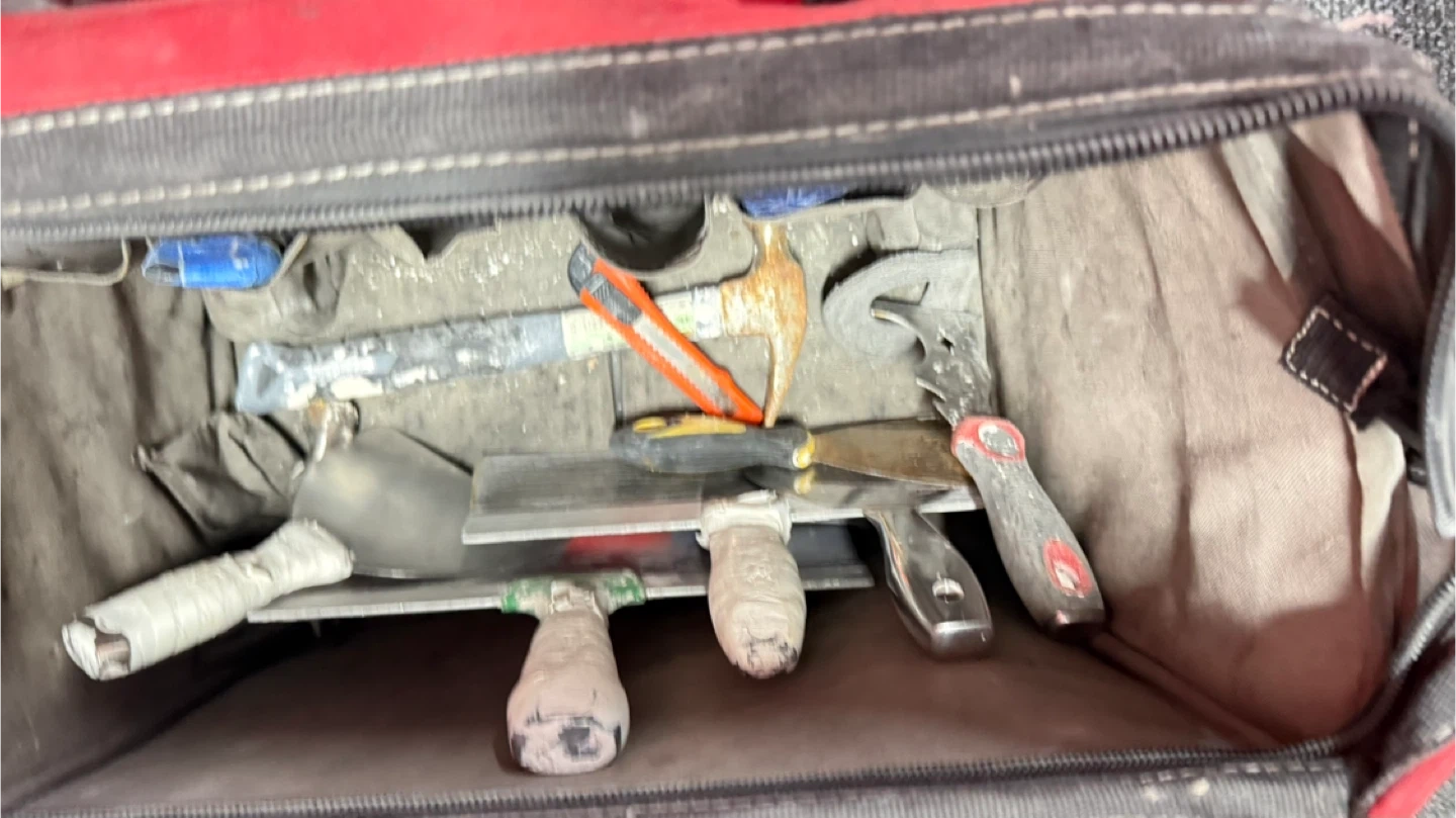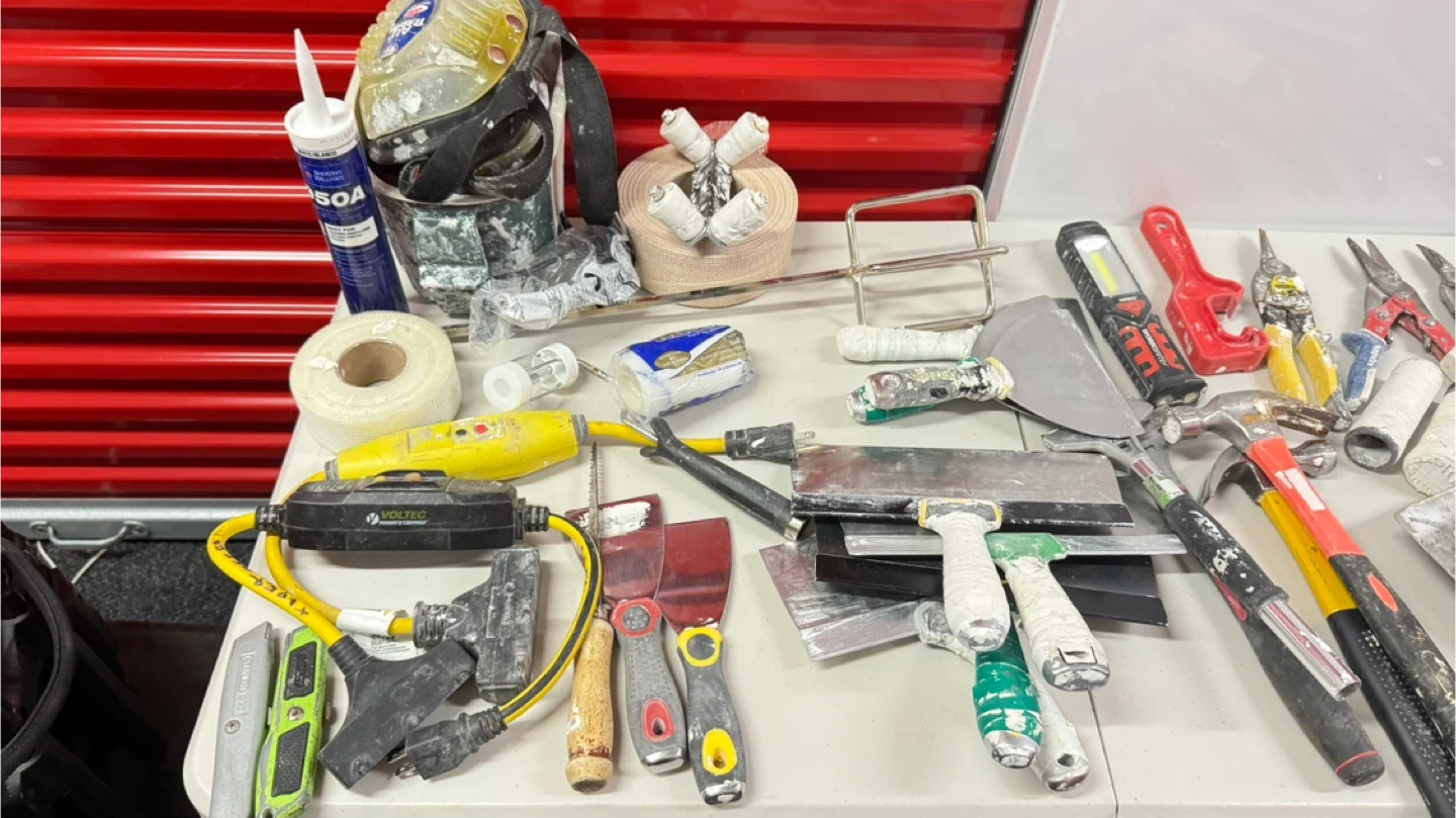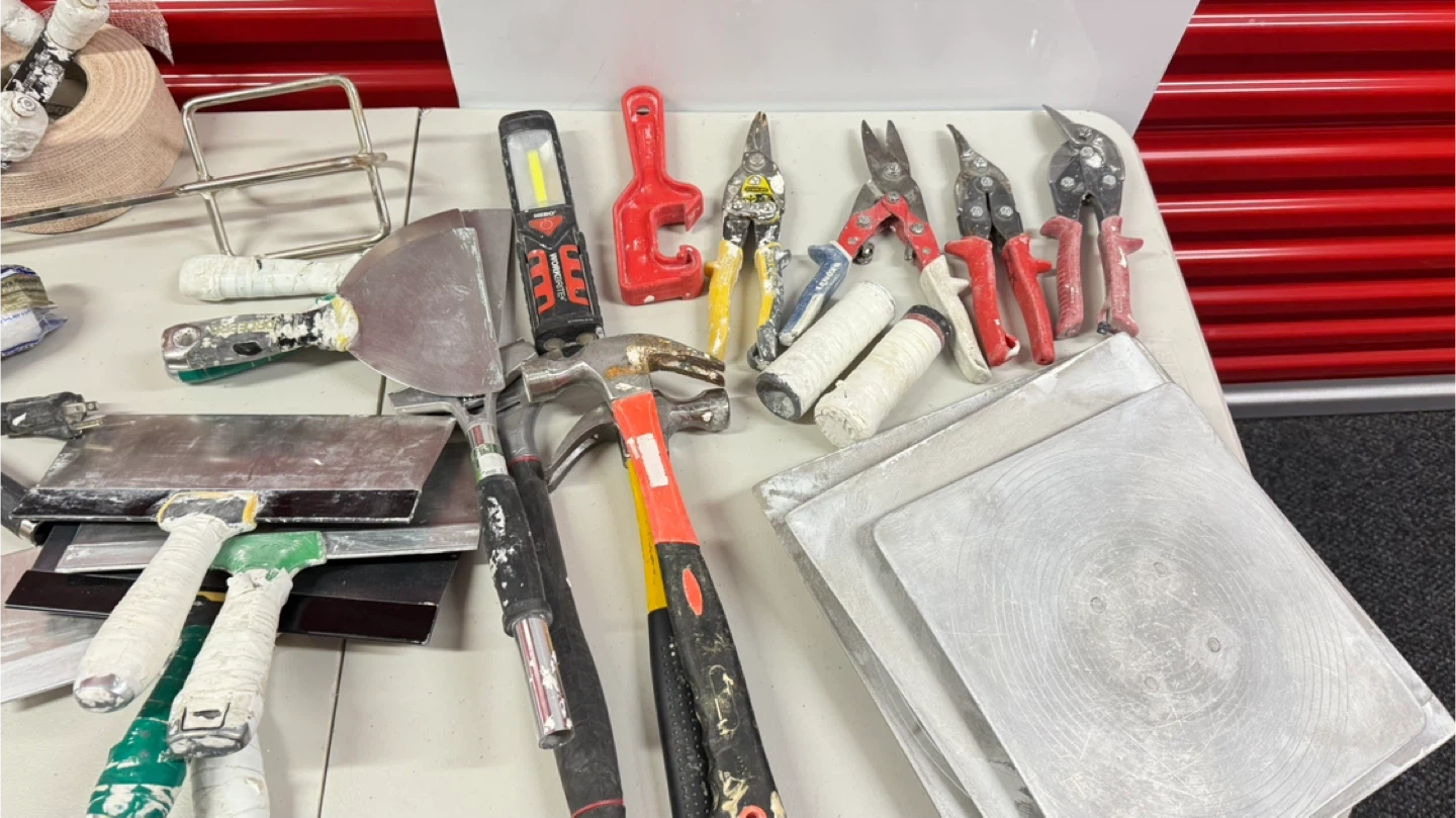 This lot includes a Husky tool bag filled with various drywall tools and accessories. You'll find multiple putty knives, a hammer, pliers, cutters, and a caulking gun. It's a great starter set for any drywall project!