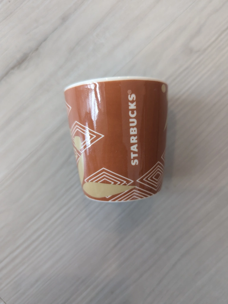 Small brown and white ceramic cup with a geometric design. It holds approximately 89 millilitres /3 oz of espresso (2 shots).