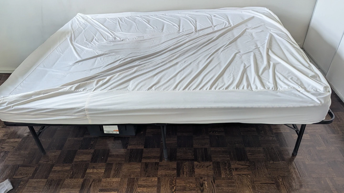 It's in good condition. It’s been used with a Utopia brand waterproof bed protector from day one, so the mattress is clean and well‑maintained.