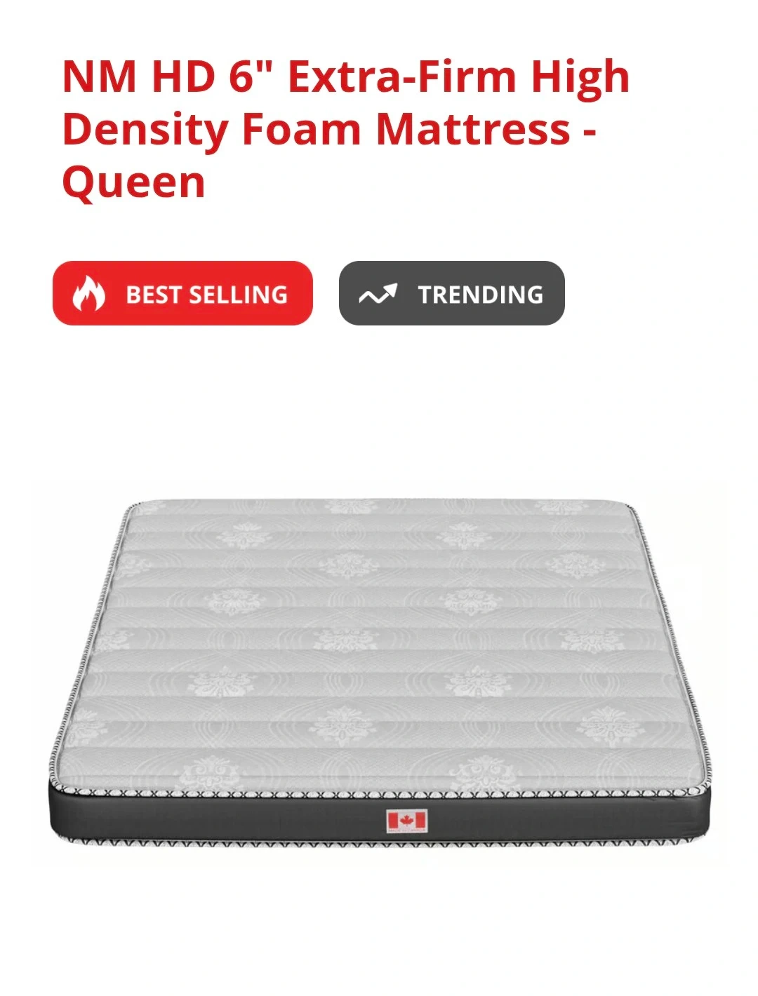 This is a queen-sized NM HD 6" extra-firm high density foam mattress. It's 6 inches thick for a supportive sleep. Suitable for a comfortable and firm sleeping surface.