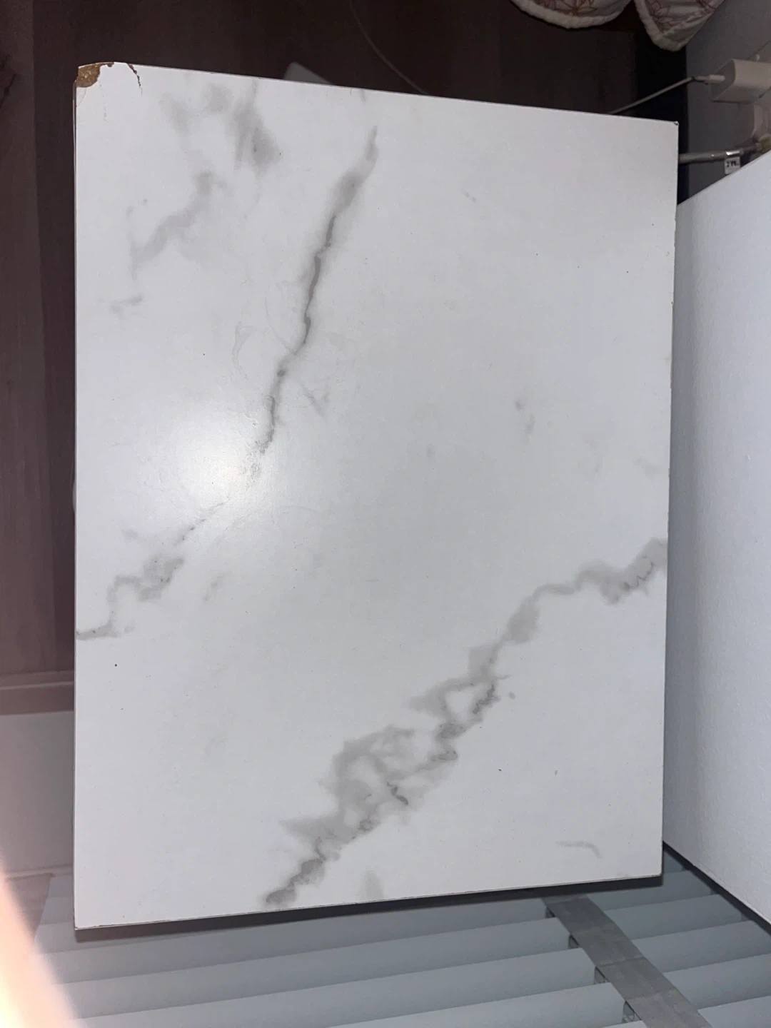 Selling a nightstand with a white marble top! It has a drawer and a shelf for extra storage. The color is white and it has a marble pattern on top. Perfect for your bedroom!