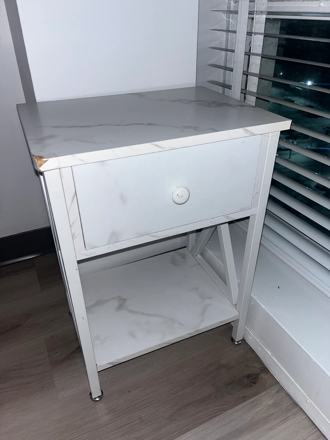 Selling a nightstand with a white marble top! It has a drawer and a shelf for extra storage. The color is white and it has a marble pattern on top. Perfect for your bedroom!