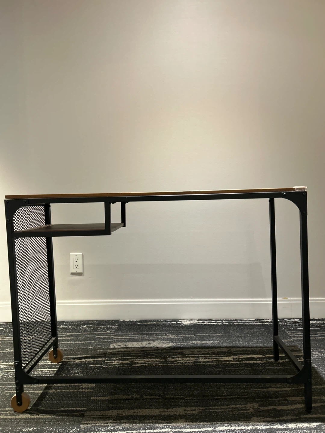 This desk features a brown wood top with a black metal frame. It includes a mesh side panel and two rolling wheels for mobility. Additional shelf on the side.