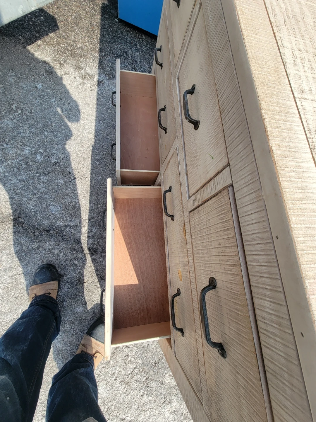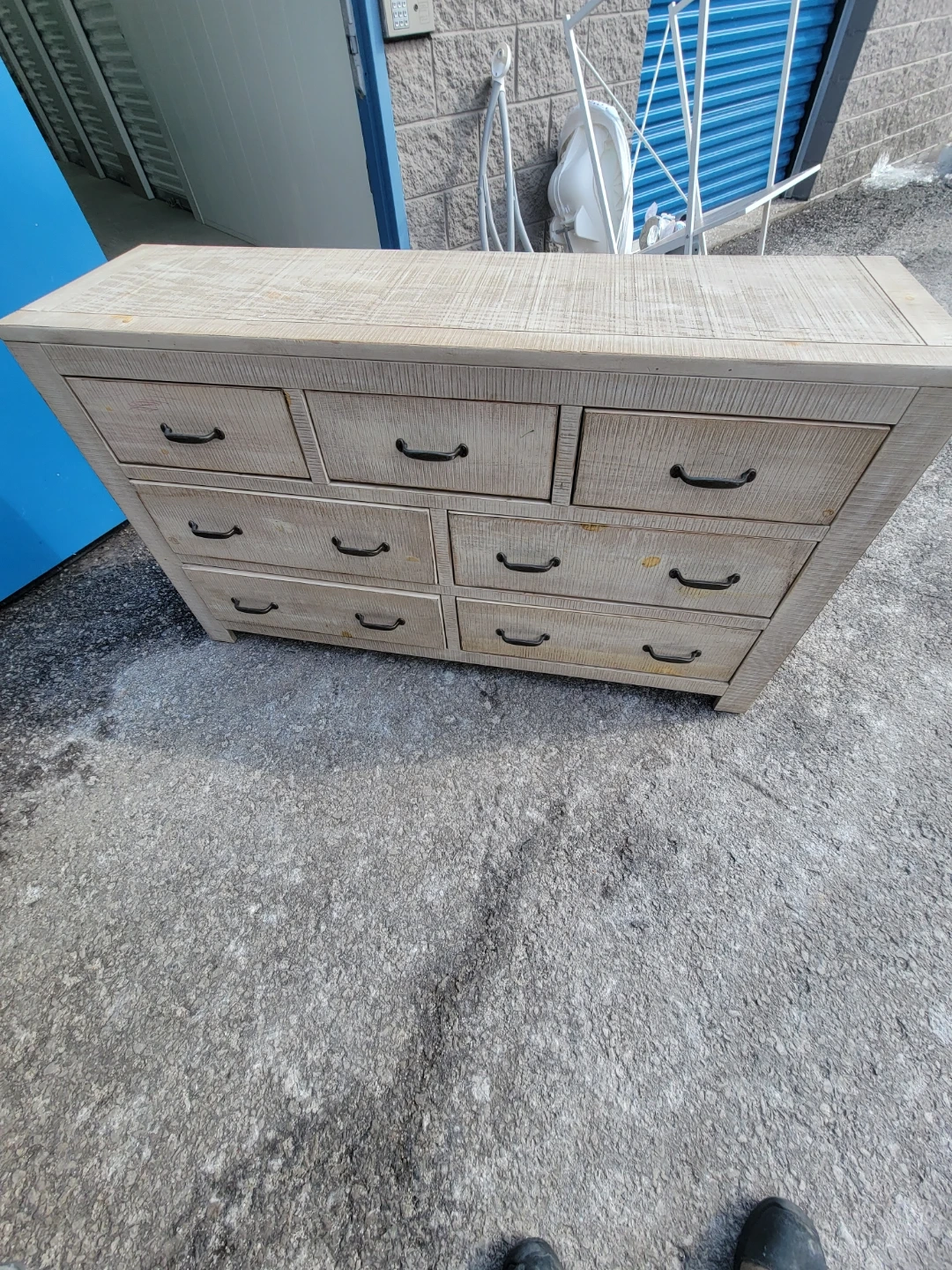 This distressed wood dresser comes with a matching mirror. It features seven drawers for ample storage. The rustic finish adds a charming touch to any bedroom. It's a great option for organizing clothing and accessories!