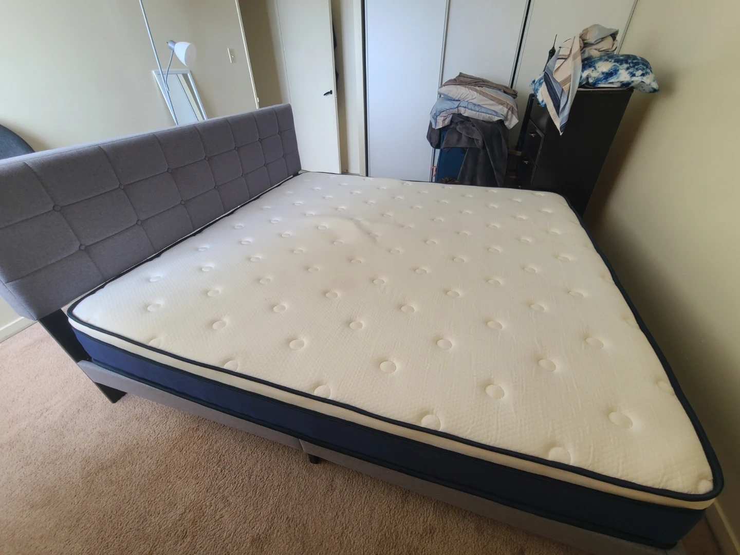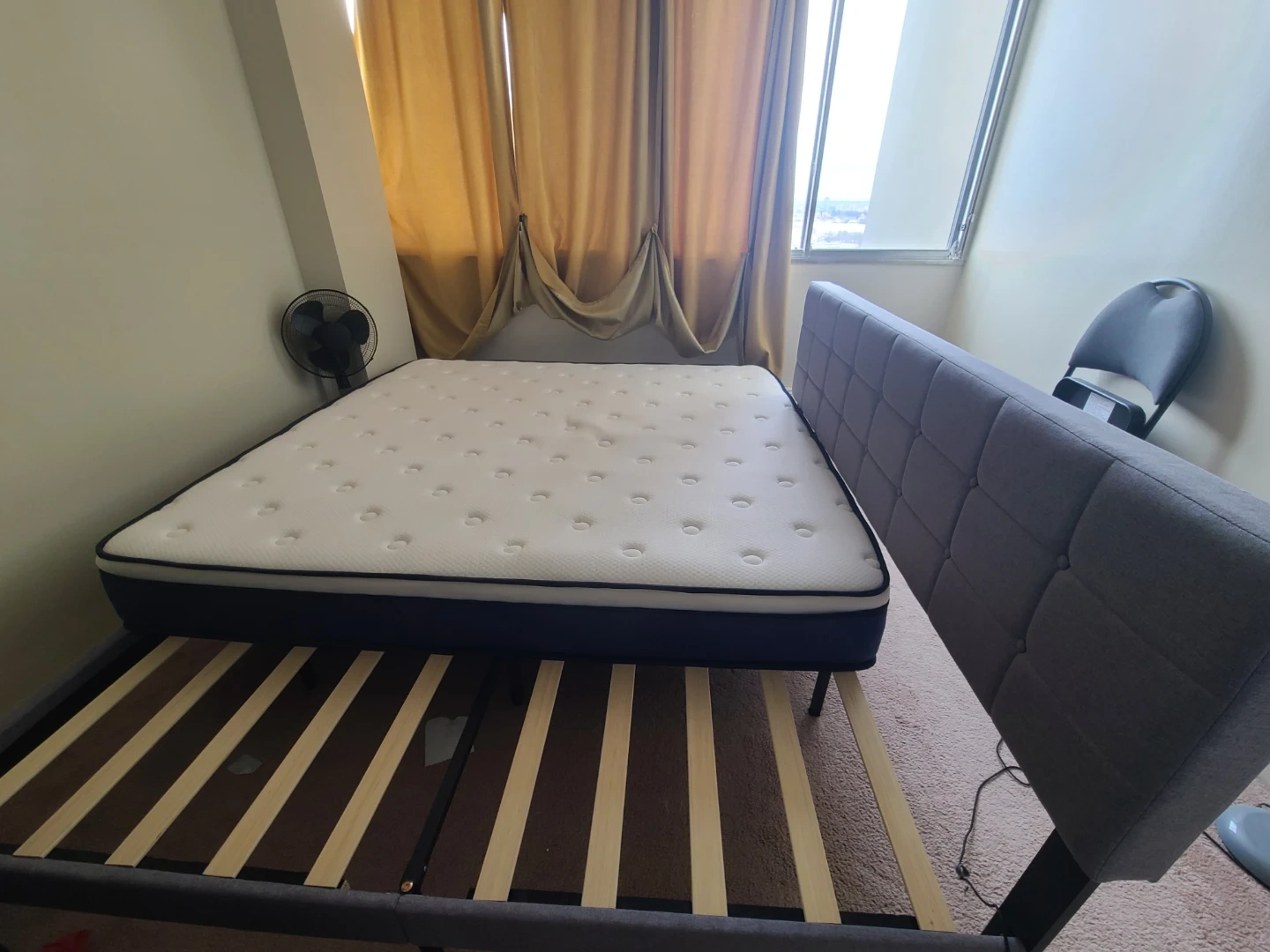 King size bed frame featuring a stylish tufted grey headboard. It comes with a comfortable mattress. The frame is sturdy and ready for use.
