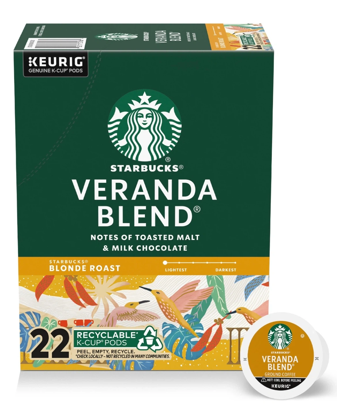 Starbucks Veranda Blend K-Cup pods. This is a blonde roast coffee with notes of toasted malt and milk chocolate. Contains 22 recyclable K-Cup pods.