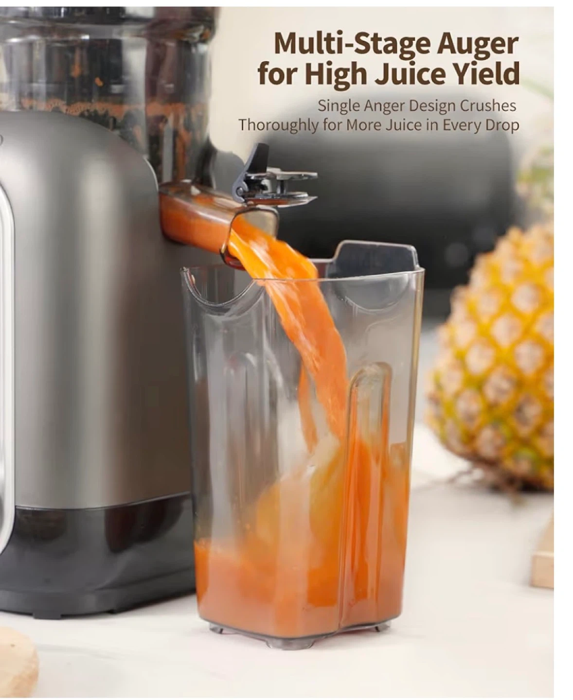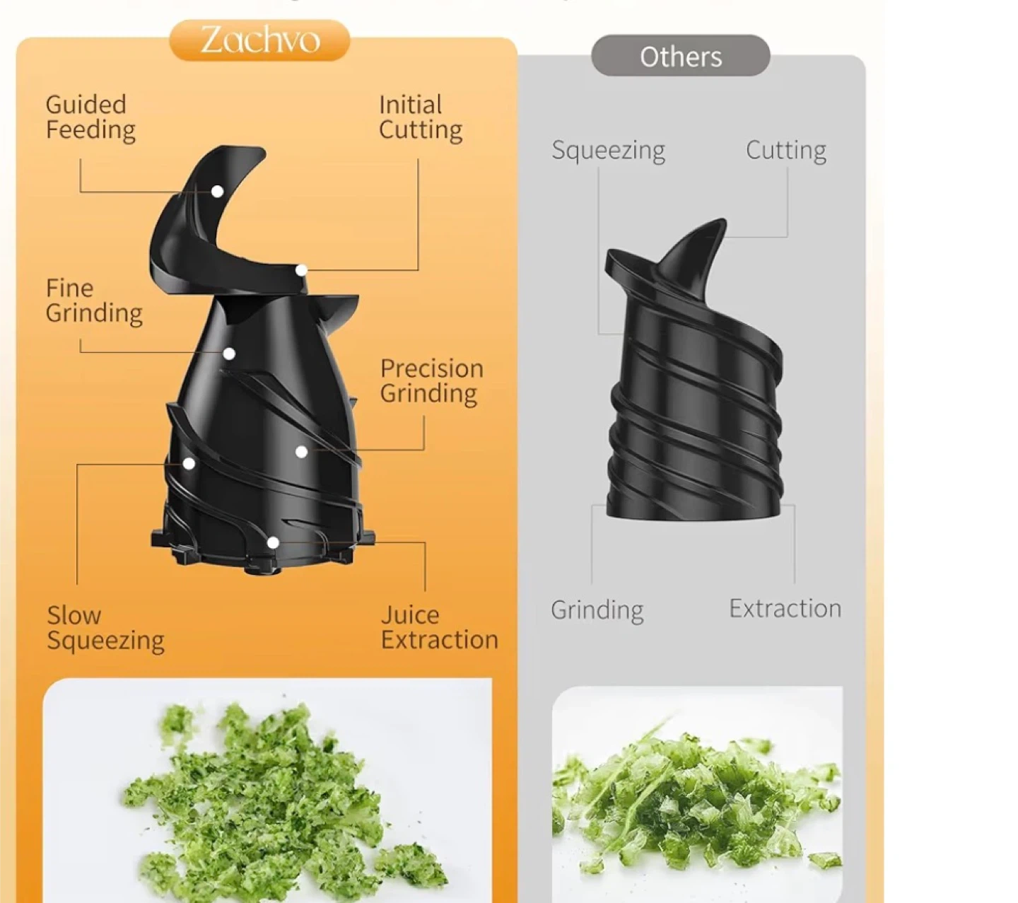 This Zachvo slow juicer is designed for real people and real kitchens. It has a 148mm wide chute and an easy-clean design. It's great for making fruit juice and frozen treats, turning fruit into creamy, spoonable desserts and cold-pressed juice with rich nutrients.