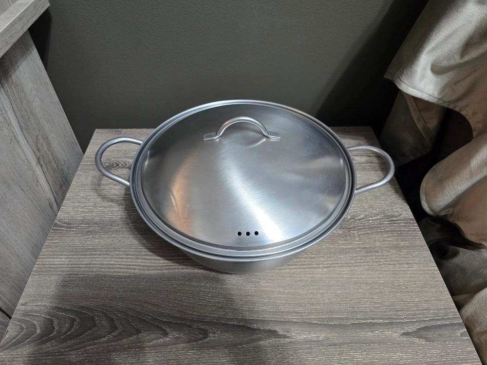 Stainless steel pot, 24cm diameter. Features a lid with a small handle and two side handles. Comes in original box.