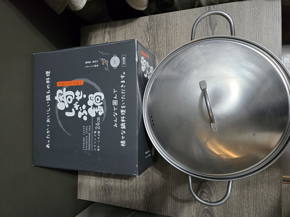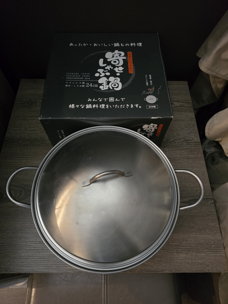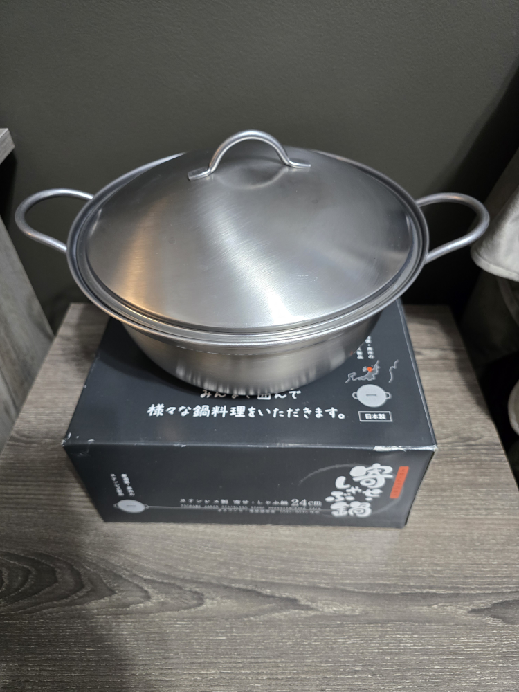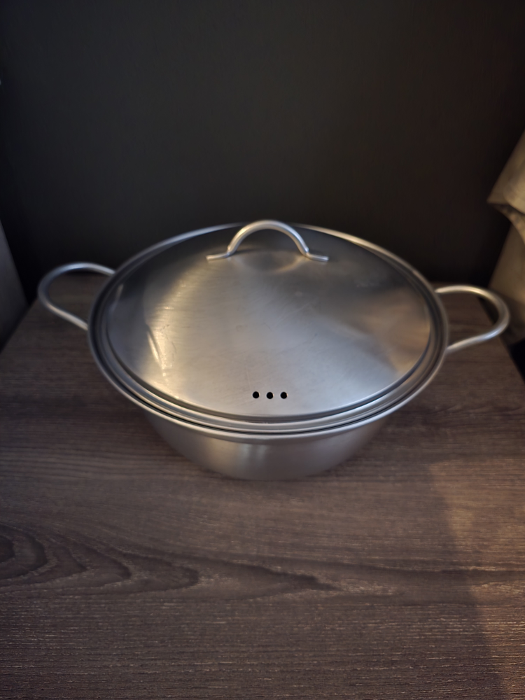 Stainless steel pot, 24cm diameter. Features a lid with a small handle and two side handles. Comes in original box.