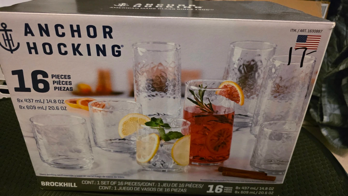 Anchor Hocking glass drinking set includes 16 pieces. Set contains 8 tumblers at 437 mL (14.8 oz) and 8 tumblers at 609 mL (20.6 oz). Glass material.