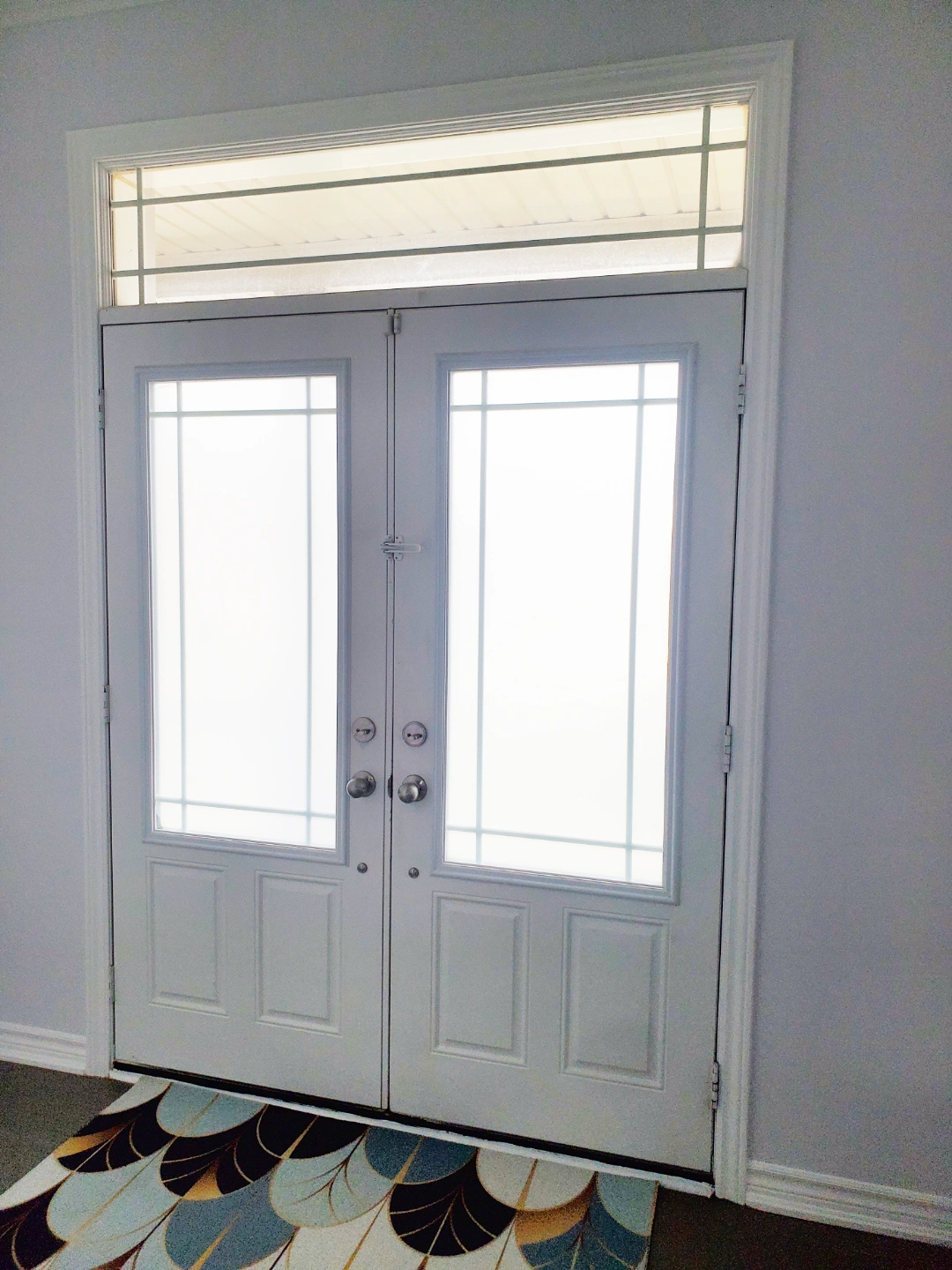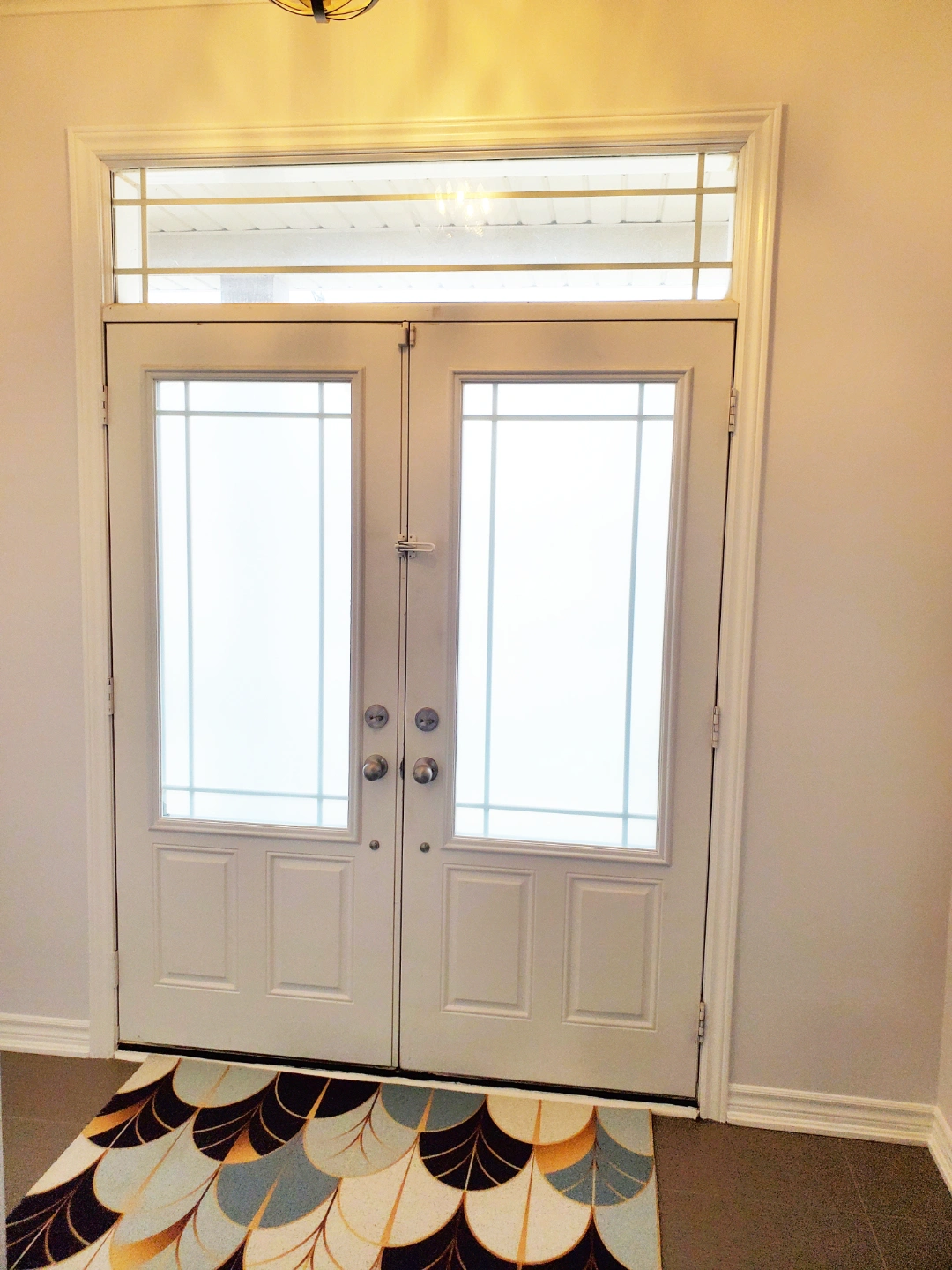 Double french exterior doors with glass inserts, ready for immediate pick up. Measurements: 64.25" W x 81" H. Thicknesss is 2" (standard exterior doors). Interior colour is offwhite, to blend in seamlessly with your foyer, and the exterior is an eggplant to give your porch a vibrant pop of colour! Top transom window is included along with hardware and door frame (65 1/2" x 97 1/2"). Doors are in great condition and ready for installation. Lock has some wear but comes with two sets of keys if desired.