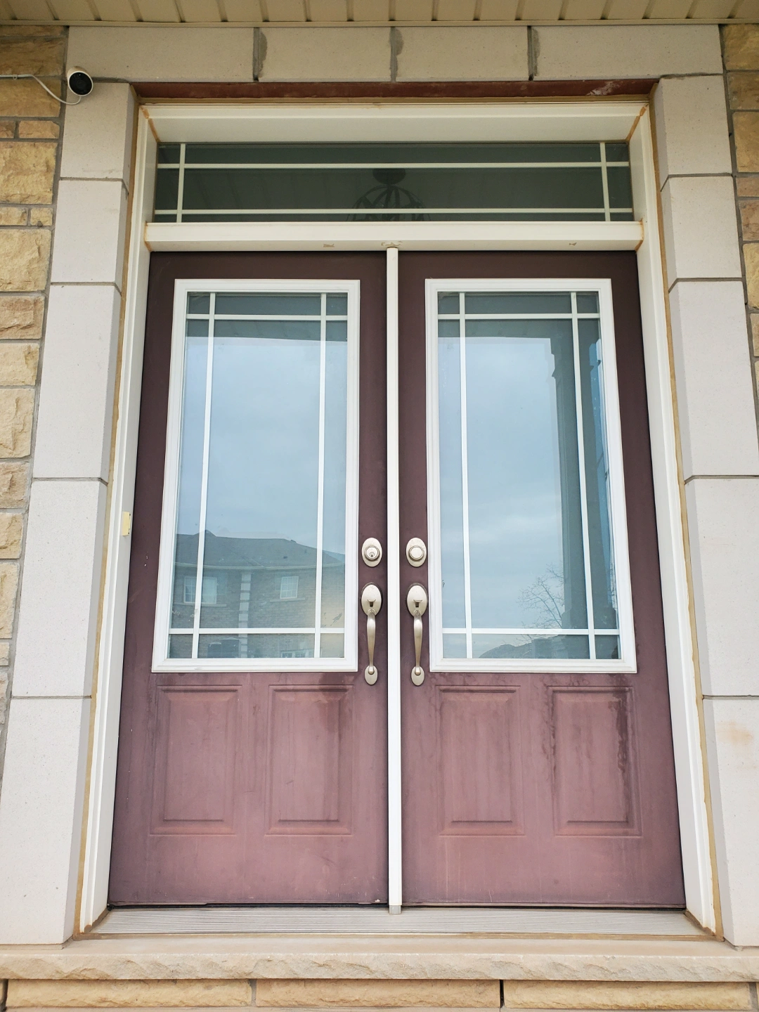 Double french exterior doors with glass inserts, ready for immediate pick up. Measurements: 64.25" W x 81" H. Thicknesss is 2" (standard exterior doors). Interior colour is offwhite, to blend in seamlessly with your foyer, and the exterior is an eggplant to give your porch a vibrant pop of colour! Top transom window is included along with hardware and door frame (65 1/2" x 97 1/2"). Doors are in great condition and ready for installation. Lock has some wear but comes with two sets of keys if desired.