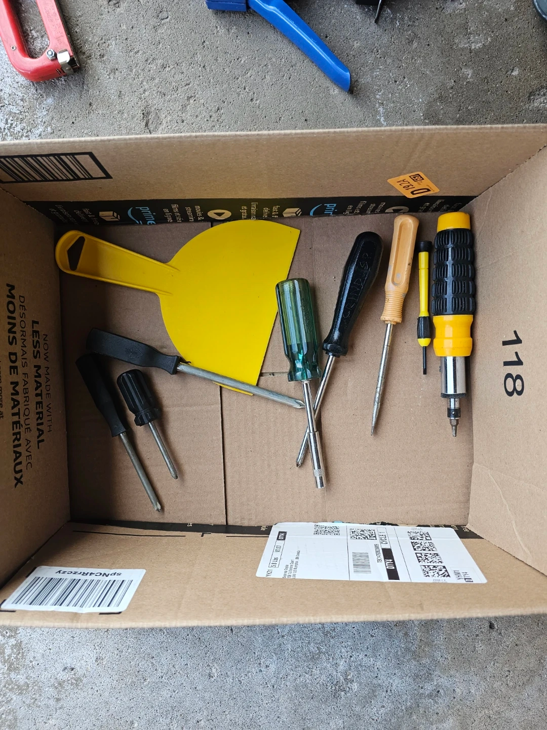 A set of screwdrivers, including a multi-bit driver with a yellow and black handle, and a yellow putty knife. The screwdrivers have various tip types. All tools are in used condition.