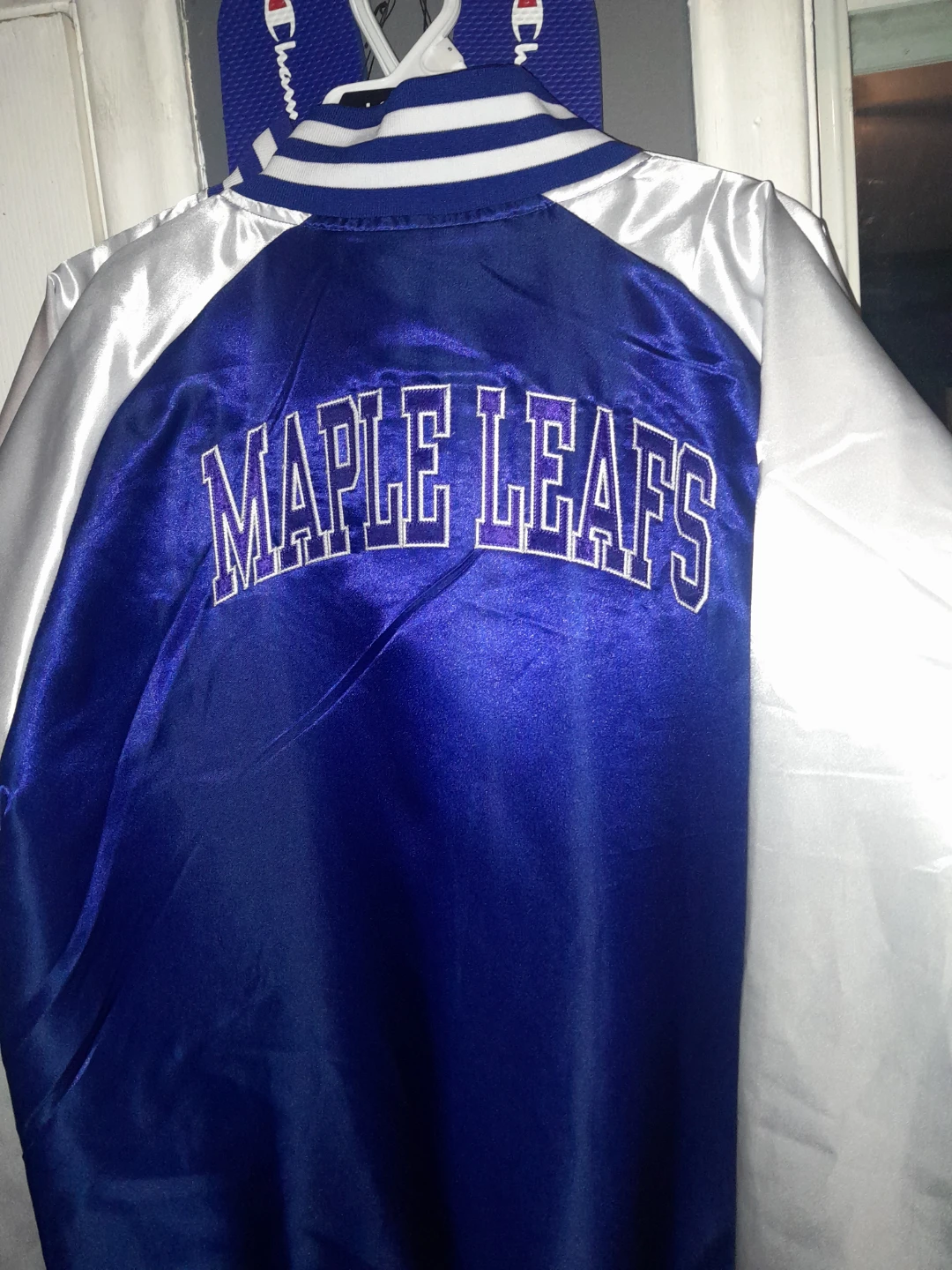 This is a satin bomber jacket featuring the Toronto Blue Jays logo on the front and 'Maple Leafs' embroidered across the back. It has white sleeves and a blue body with ribbed cuffs and hem. It's a great piece for any fan!