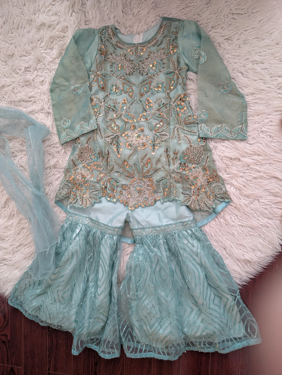 Beautifully crafted light blue gharara set. It's intricately embroidered with silver and gold threads, accented with shimmering sequins. The set includes a kameez, sharara pants, and a dupatta, all in a lovely hue.