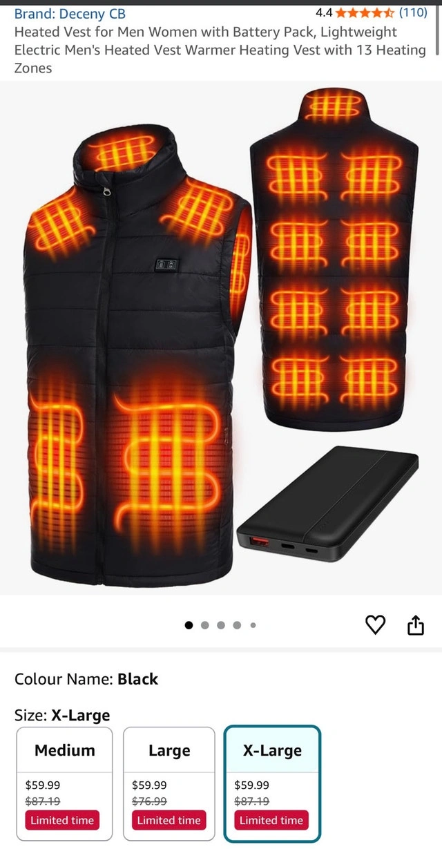 Stay warm with this brand new, Deceny CB heated vest, size XL. This lightweight electric men's heated vest features 13 heating zones and comes with a battery pack. Perfect for outdoor activities or staying cozy indoors. If the ad is up, it's available!