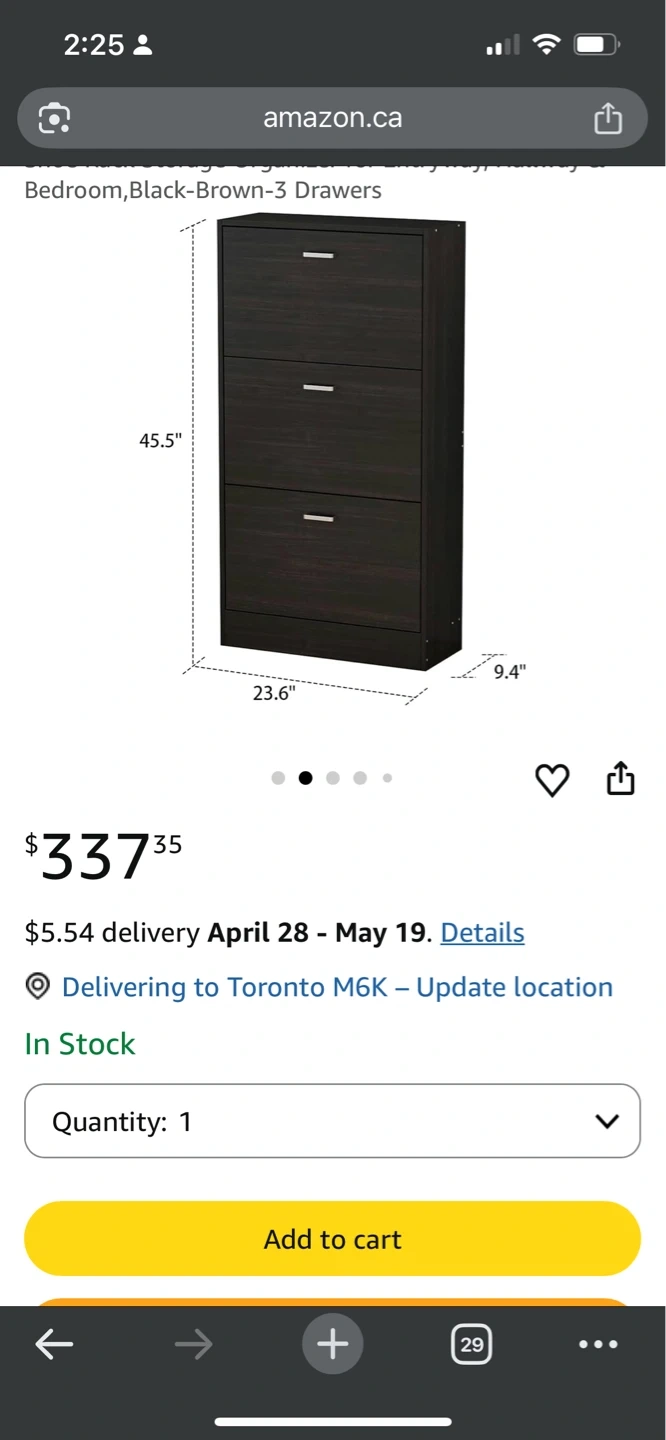 This is a 3-drawer storage organizer with a black-brown finish. It's 45.5" tall, 23.6" wide, and 9.4" deep. It has silver handles for each drawer. Shoe cabinet