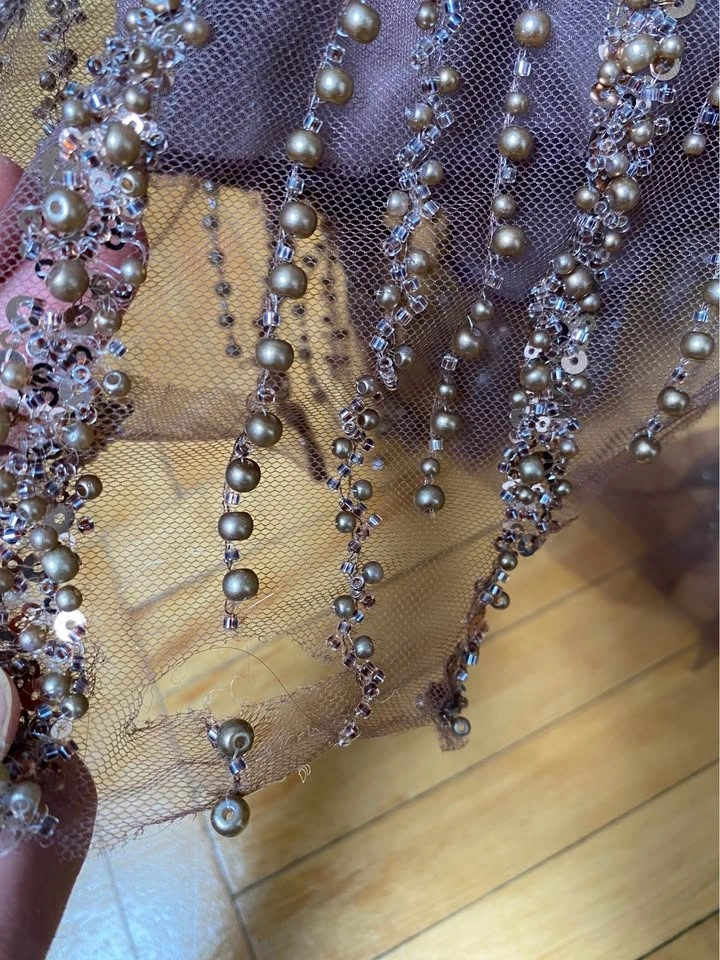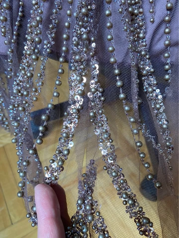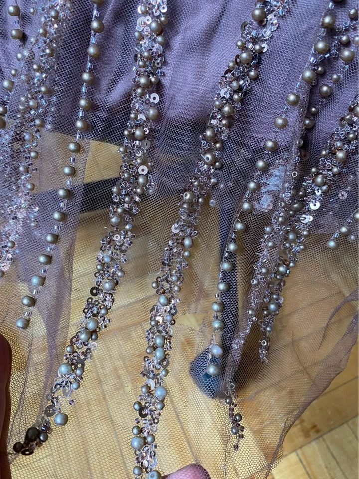 Wore to a wedding once. Small rips/ delicate tears at the bottom of the dress, as it shows in the pictures. Great for a special event. Originally paid $500, selling for $320. Pickup only.