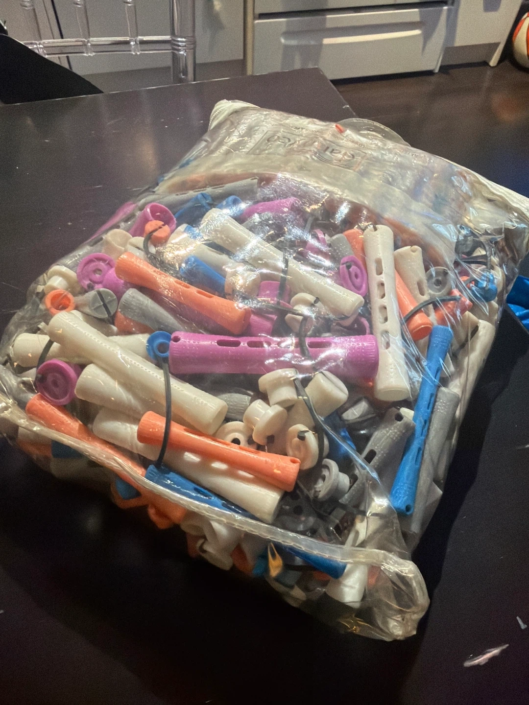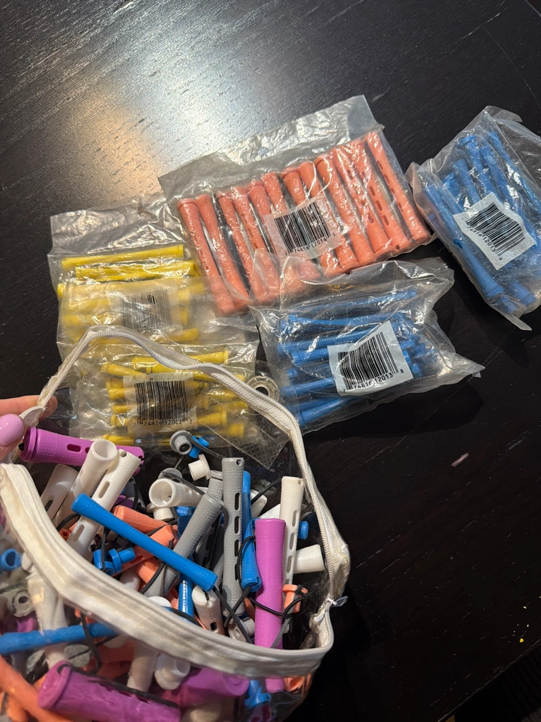 Large lot of assorted perm rods in various colours and sizes. These are great for hair perming services. Includes orange, blue, yellow, white, pink, and grey rods.