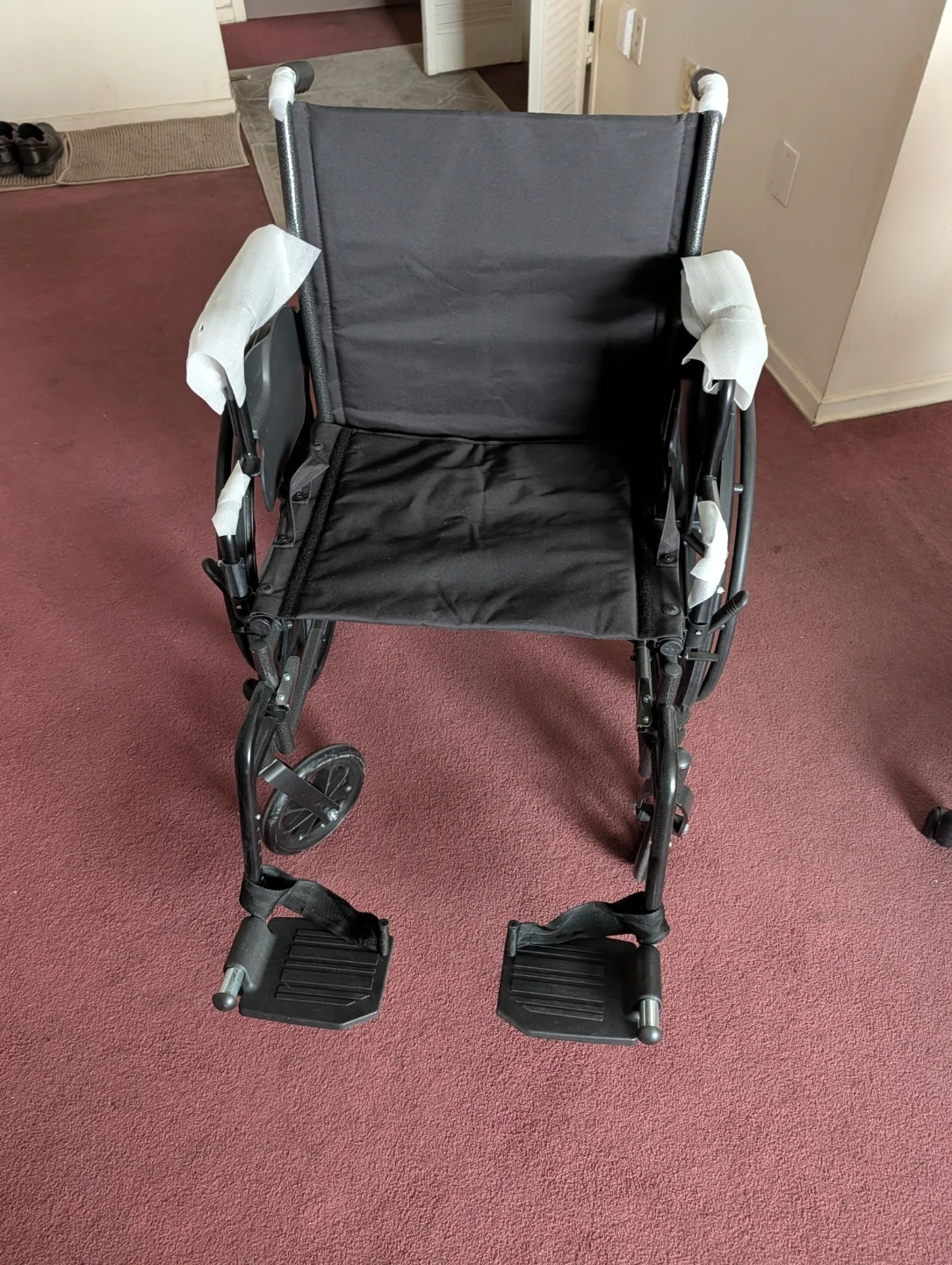 This is a black transport wheelchair. It features a padded seat and backrest for comfort. The footrests are adjustable. It's designed for easy transport and mobility assistance.