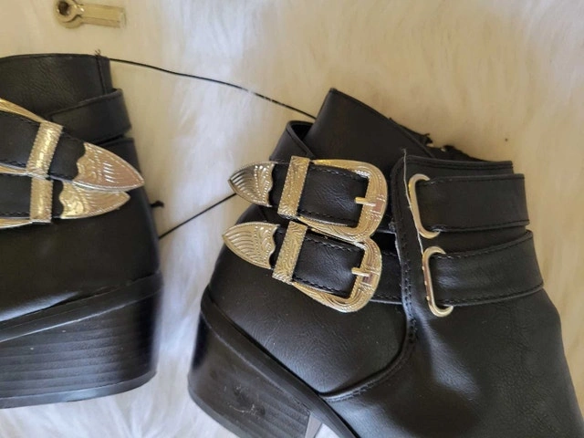 Step out in style with these new black ankle boots, featuring a chic design with decorative buckle straps and a comfortable low heel. These boots are brand new with tags, offering a blend of fashion and comfort for any occasion. * Size: 7 * Colour: Black * Style: Ankle Boot Looking to add a bit of flair to your wardrobe? These boots are just waiting to join your shoe collection. And remember, if the ad is up, the boots are available – ready for a new home! Payment: Cash accepted