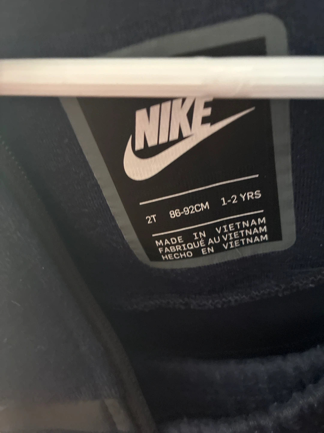 This Nike Tech Fleece tracksuit is perfect for your little one. It's a navy blue color and designed for comfort and style. The set includes a zip-up hoodie and pants, both in size 2T (86-92cm) or 1-2 years. Made in Vietnam.