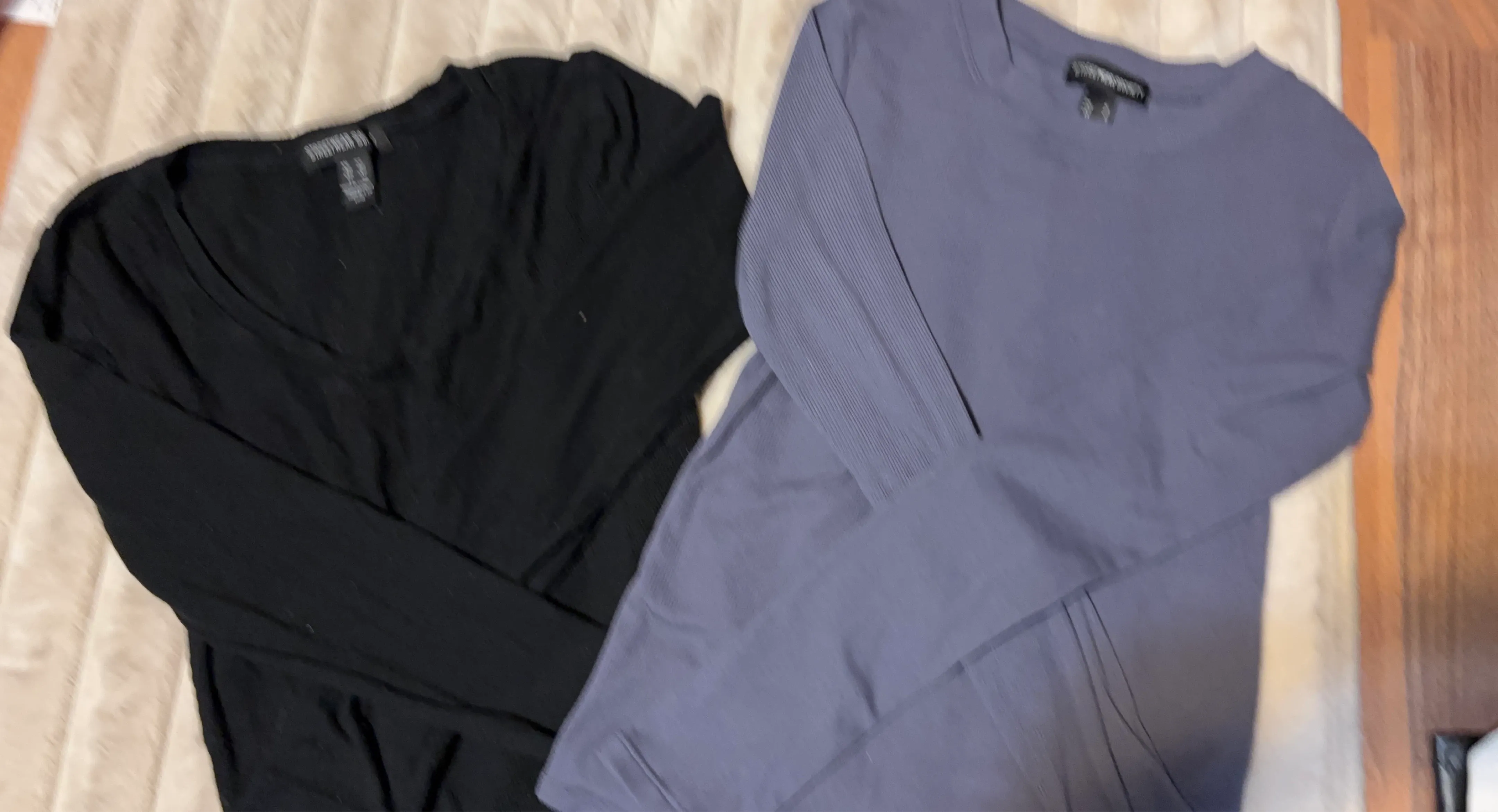Two long sleeve tops from STREETWEAR CO. One is black with a V-neck and the other is a dusty blue with a square neckline. size XS-S