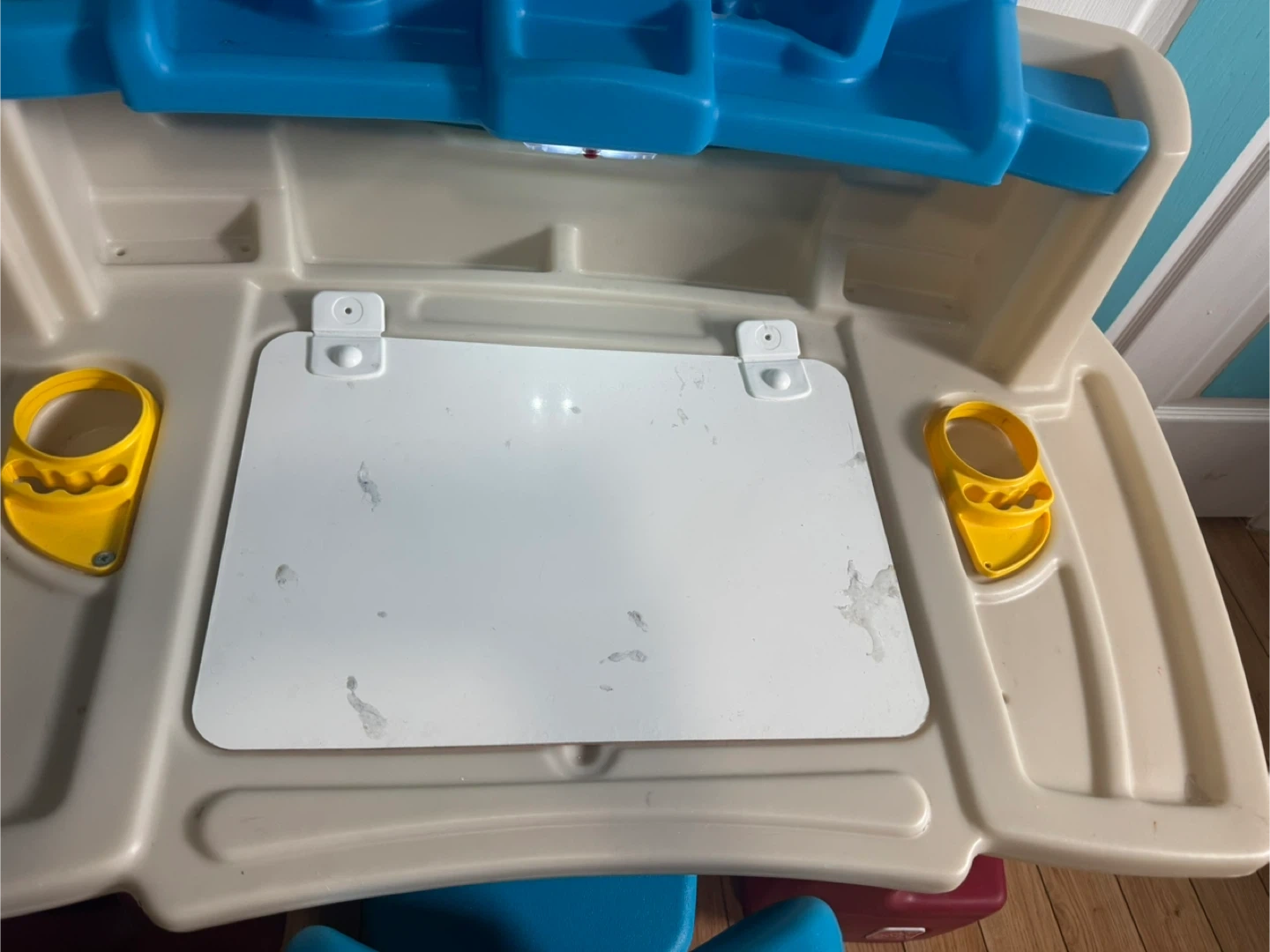 DRAWING BOARD IS INCLUDED BUT NOT SCREWED ON. SOME DRIED SLIME STUCK TO BOARD.