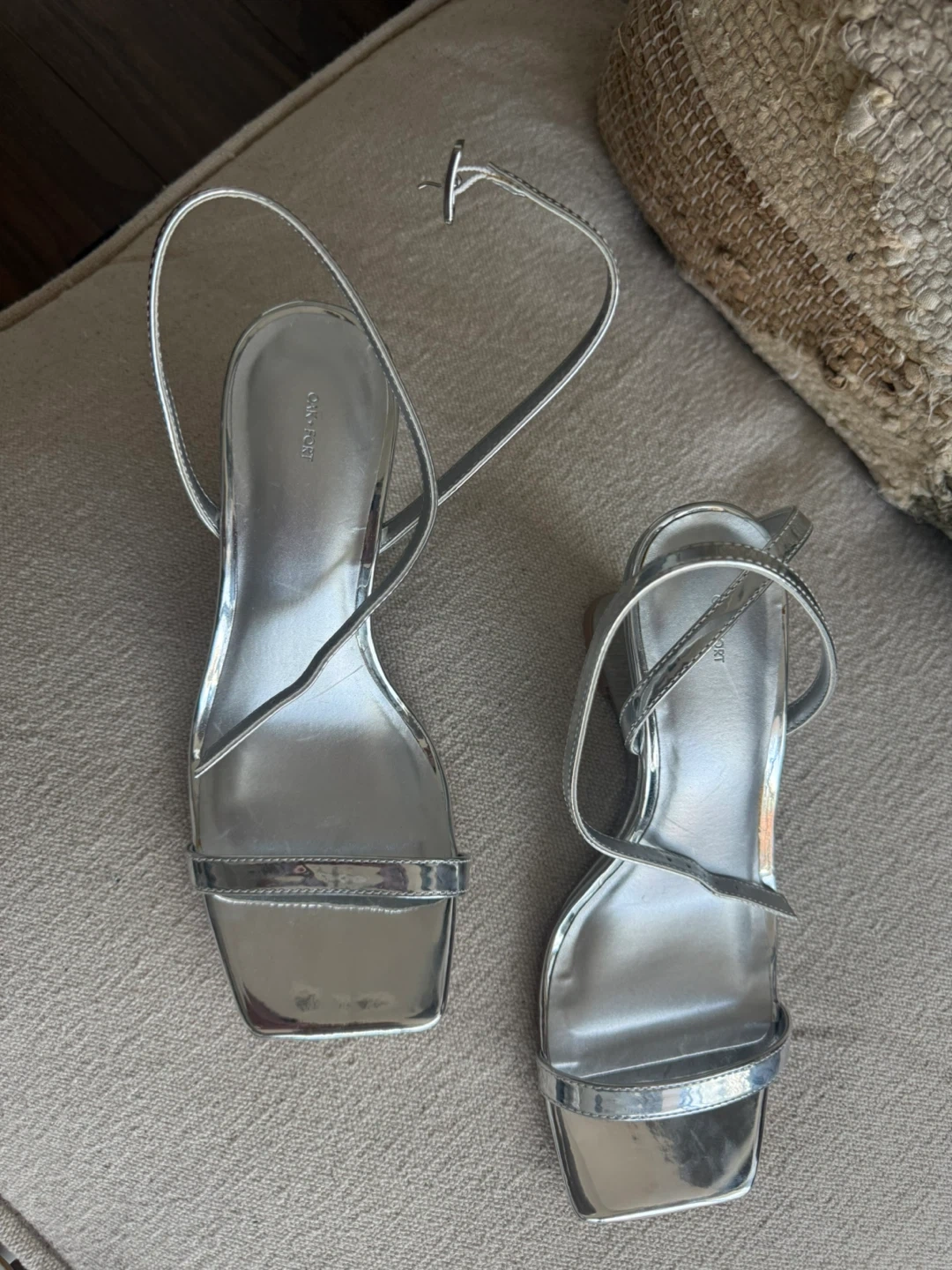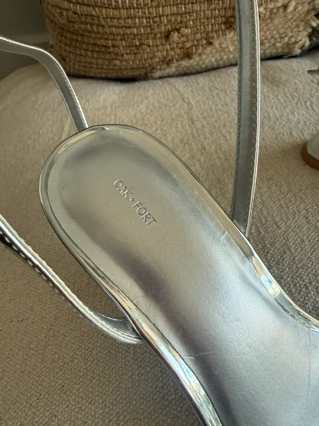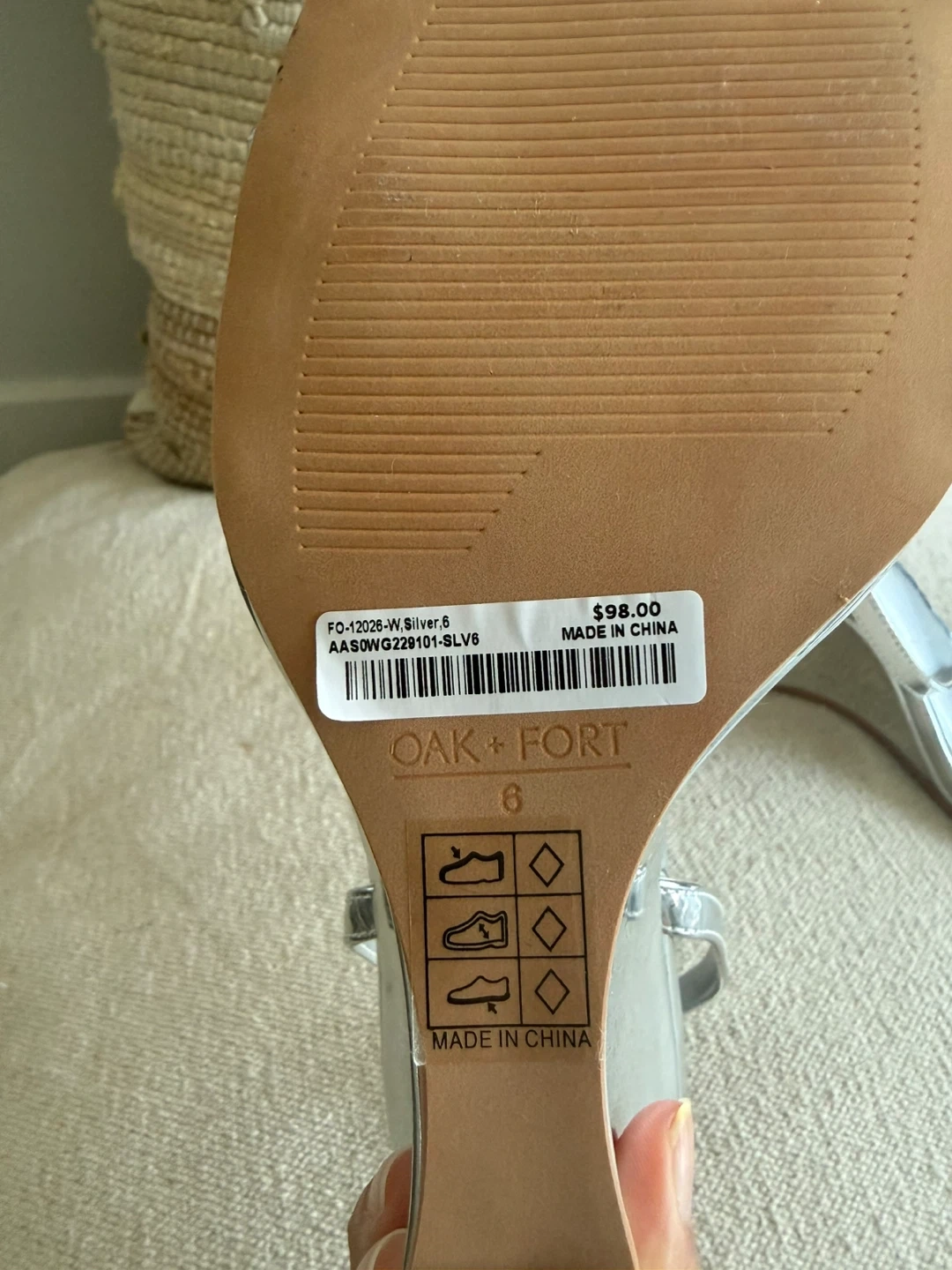 These are Oak + Fort wedge sandals in a striking silver colour. They feature thin ankle straps and a square toe design. Size is 6.