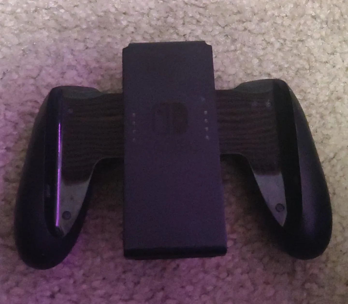 This is a Nintendo Switch Joy-Con grip accessory. It's black and made of plastic. It provides a more comfortable feel when playing with Joy-Cons. All you will see are some very minor scratches