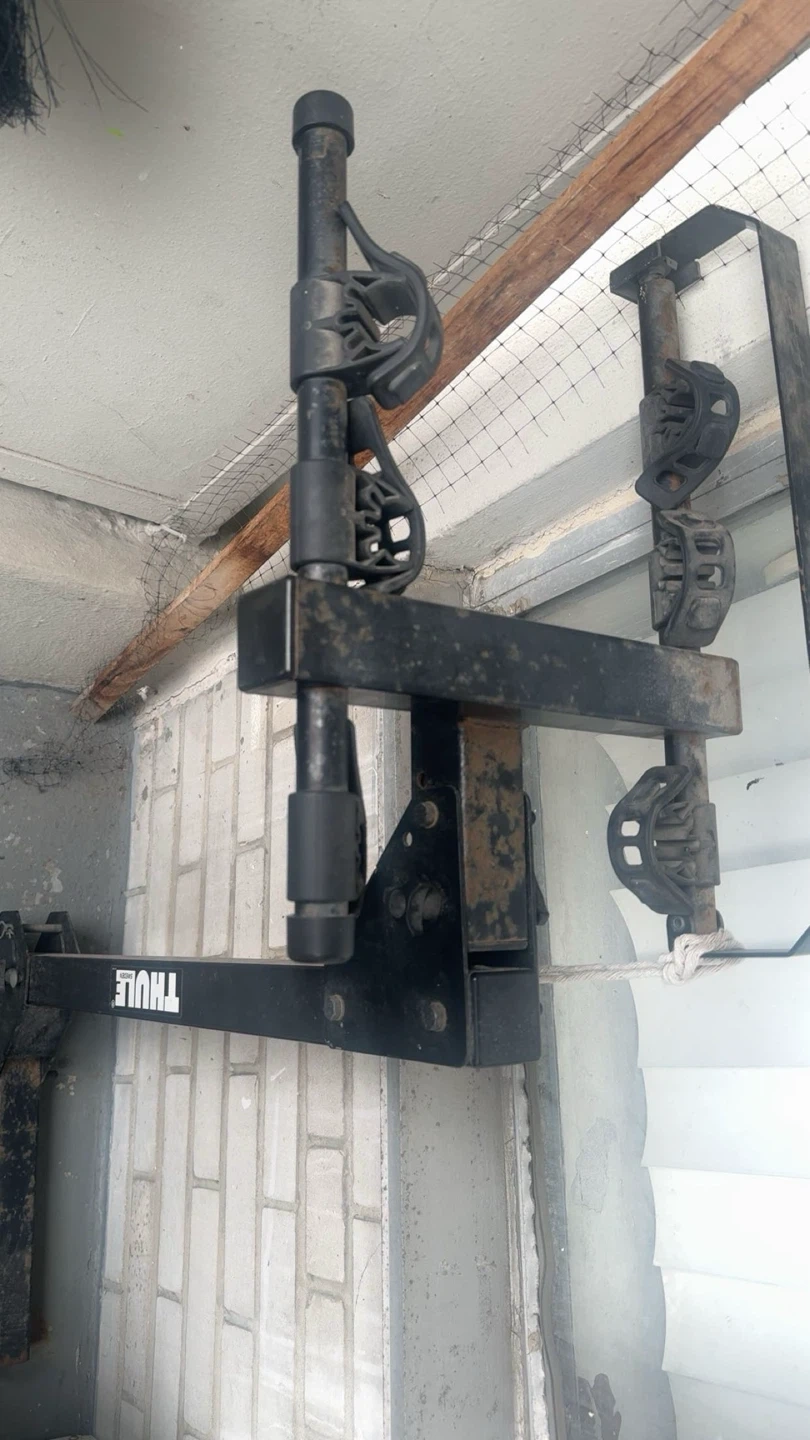 Thule 3-bike rack in good condition overall. Holds 3 bikes. Has all straps and cradles. Missing keys, but replacement locks can be easily purchased and installed. Shows some rust from long-term storage. Priced accordingly for a quick sale. This rack is great for transporting bicycles on your vehicle.