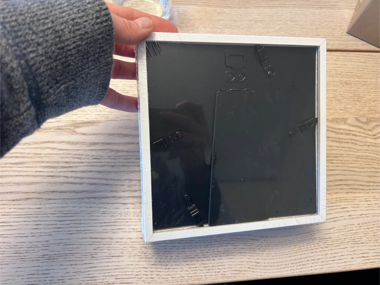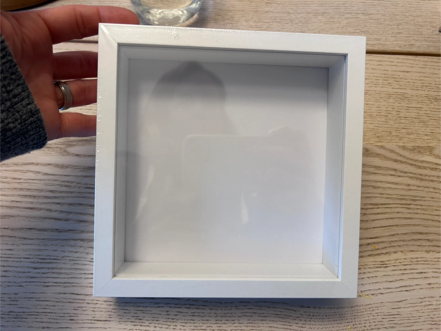 New in package white shadow box frame, perfect for displaying small keepsakes or art. It's 6x6 inches and comes in original plastic.